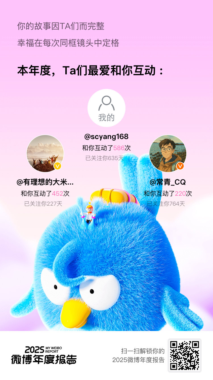微博年度报告一路同行的回忆闪闪发光,每一次互动都如此美好。感谢让我的日常分享变成值得回放的片段~新一年,继续和你们在微博里相遇、记录、陪伴,一起写下更多故事吧~微博之夜 2025微博年度报告