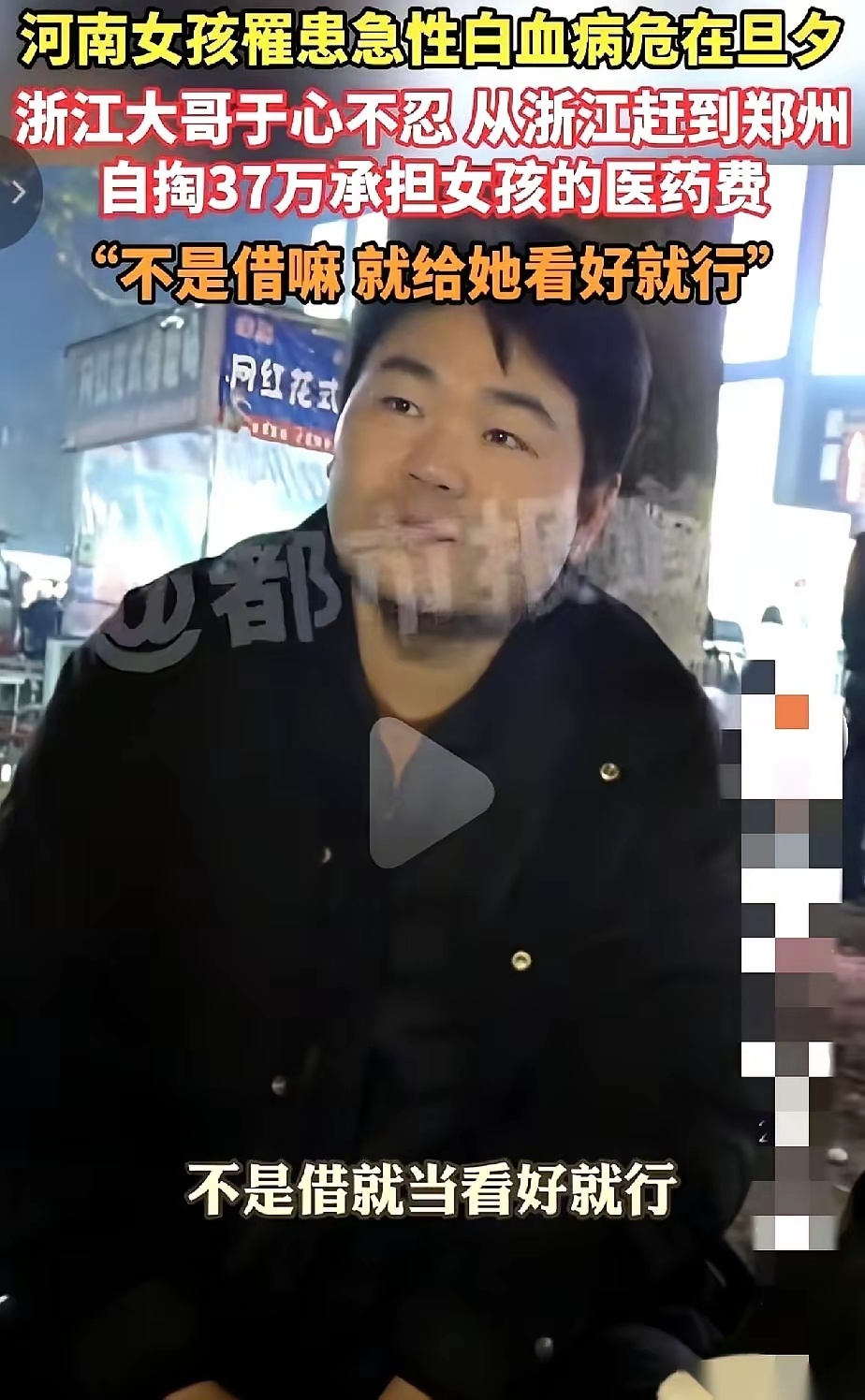一个素未谋面的白血病姑娘,在河南摆摊给自己挣医药费。一个浙江大哥看到了,直接从浙江开车杀到郑州,掏了37万,直接说:“不是借,就是给你看病的。”理由朴素得让人想哭:“我还年轻,身体好,钱没了再挣。她再不治,命就没了。”