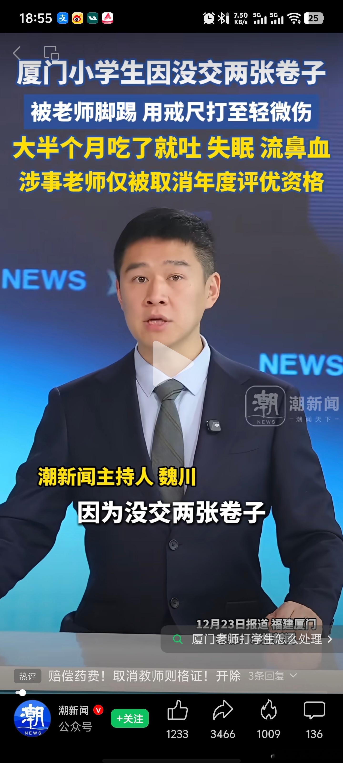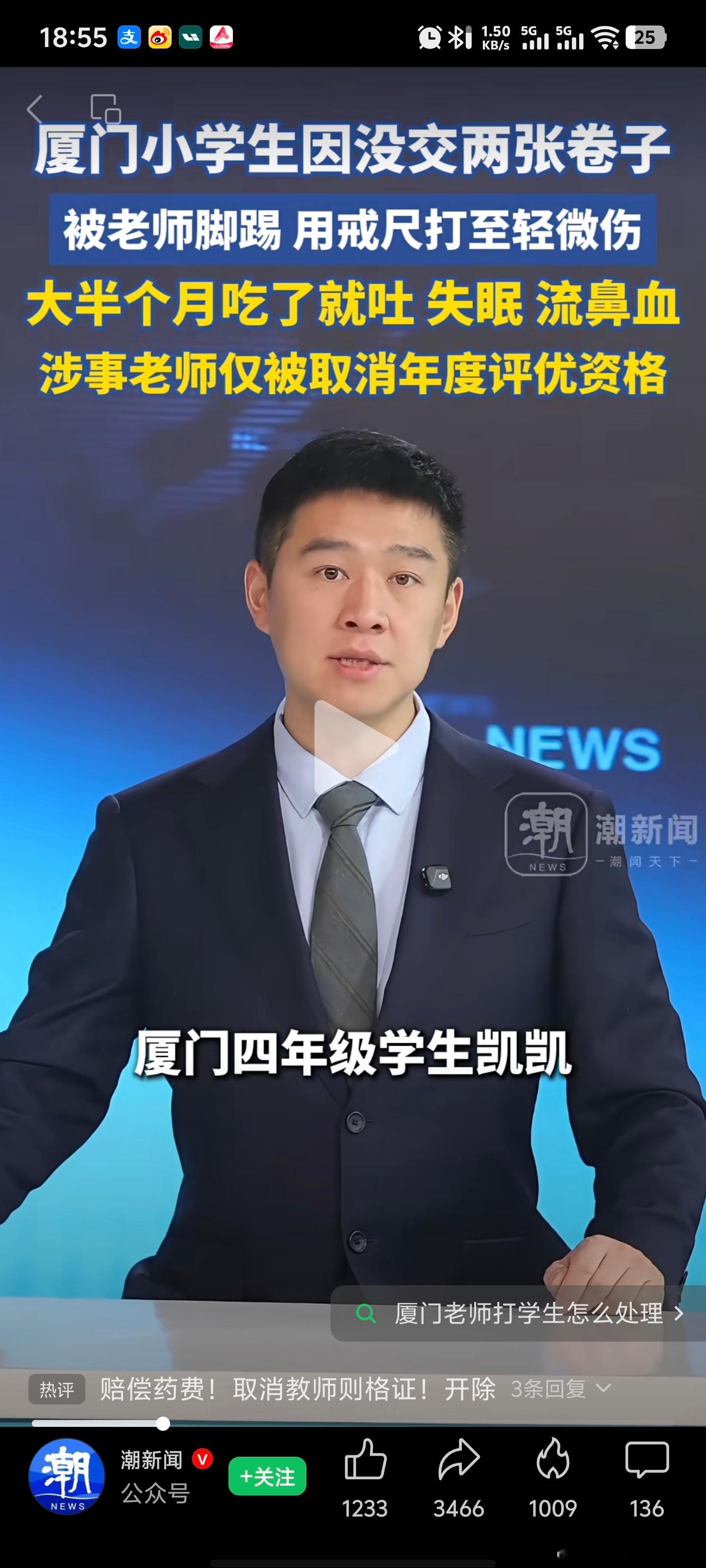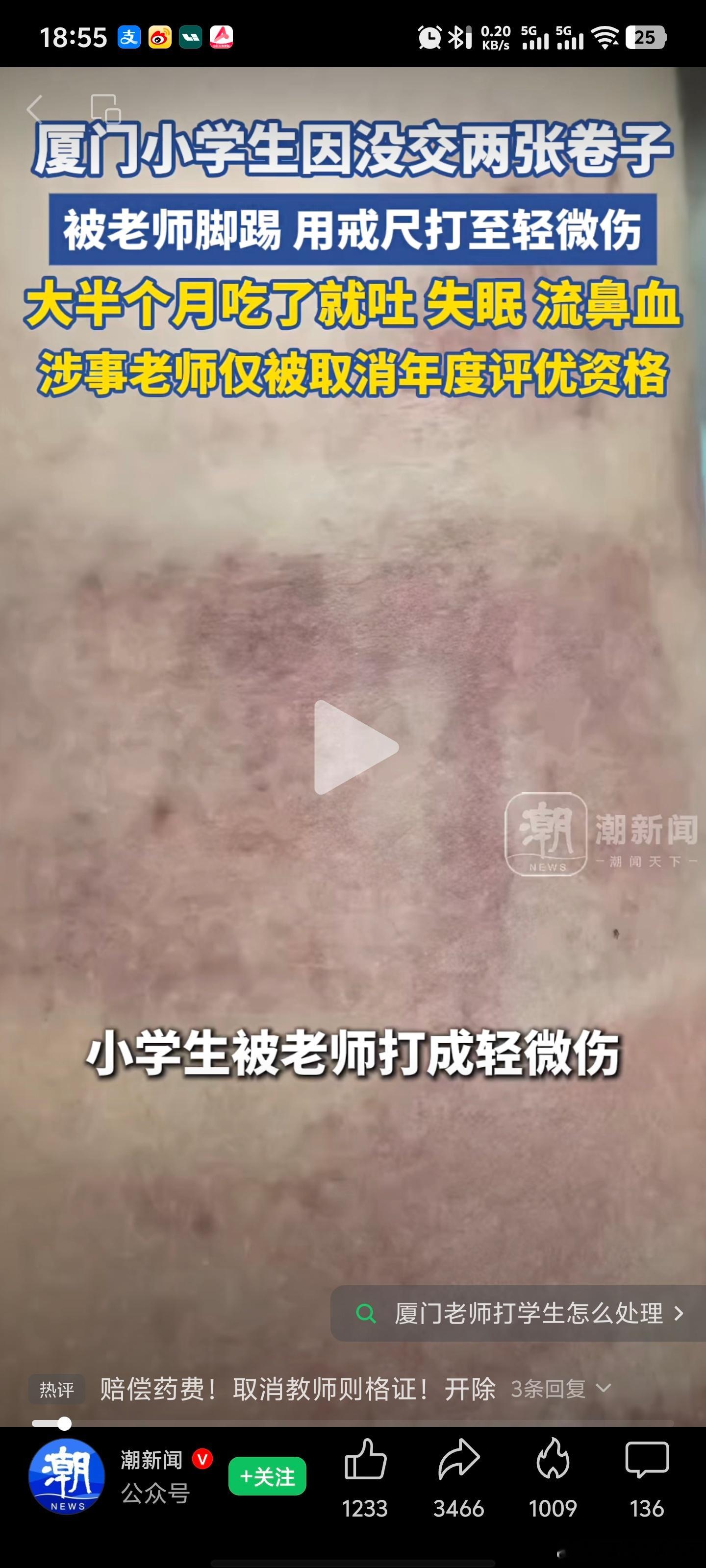 厦门小学生没交两张卷子被老师打成轻伤 厦门哪家学校的老师?这还不停职抓起来吗?不论是不是真的因为两张卷子,打孩子这也太过分了吧?