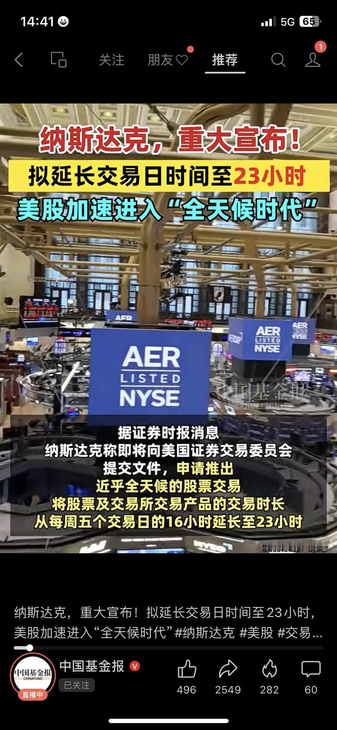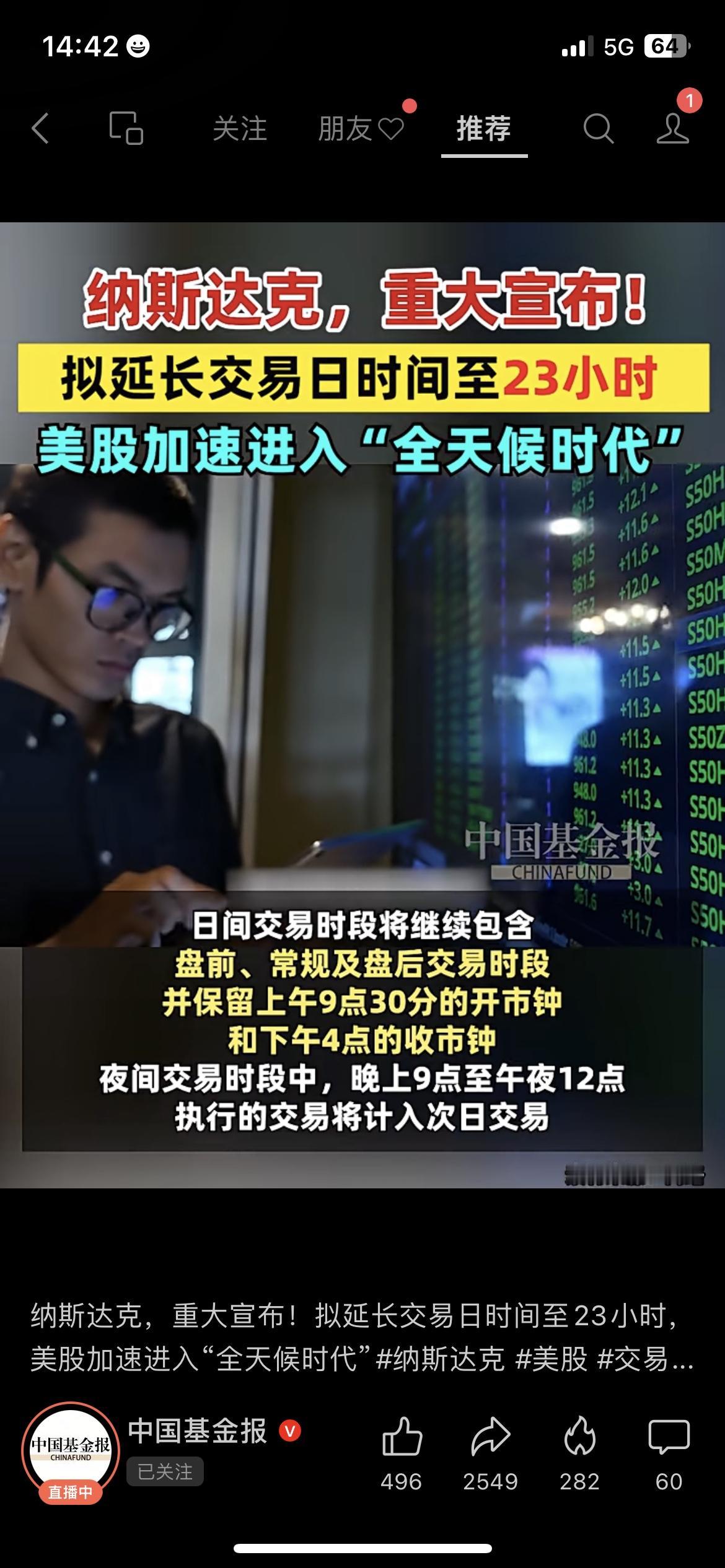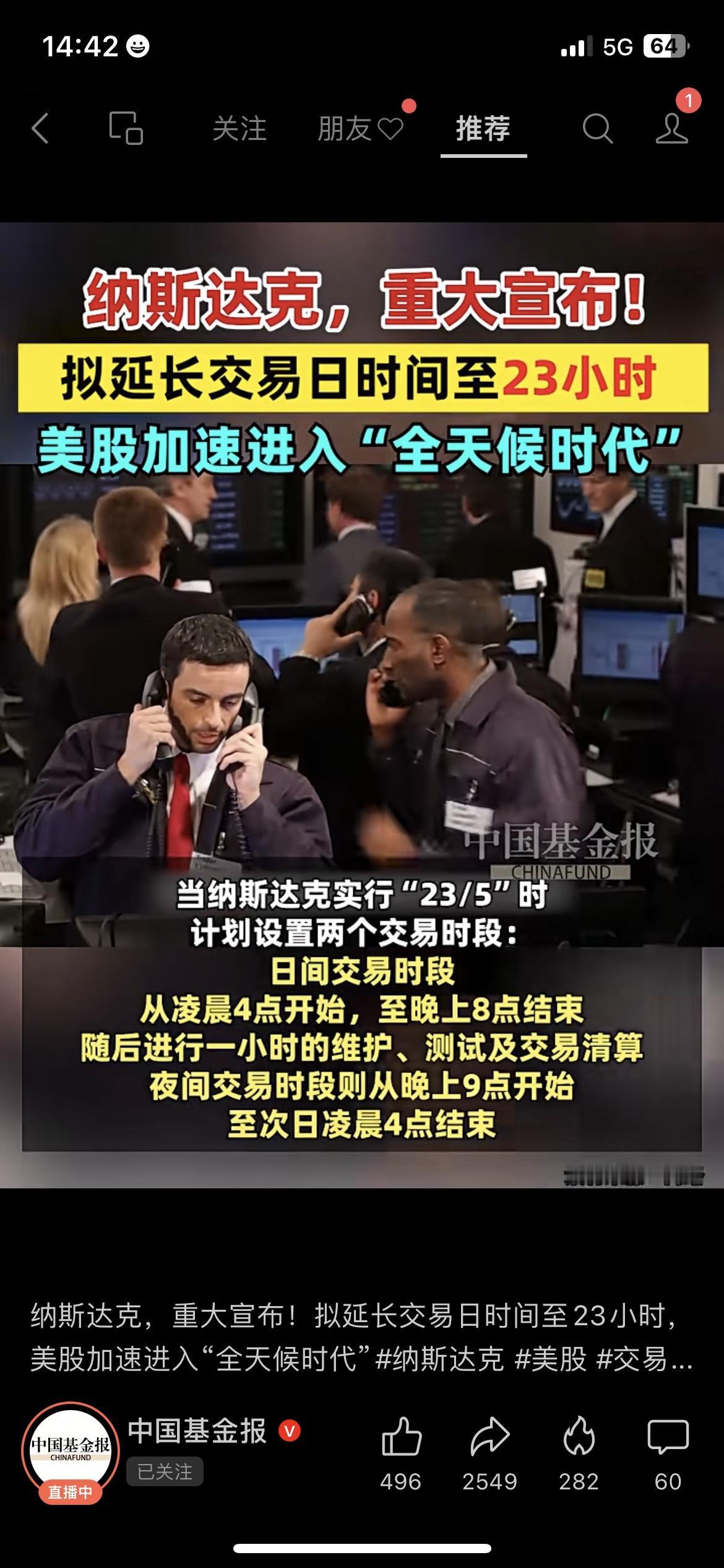 赶紧看!纳斯达克要延长交易到23小时,美股迎全天候时代 咱炒美股的工薪族注意了,权威渠道明确说纳斯达克要申请延长交易时间了! 从原来的16小时加到23小时,分日间和夜间两个时段,美股要进“全天候时代”。 别踩坑的是,咱国内散户炒美股得注意时差,熬夜交易身体扛不住,新手别盲目跟进。 我表哥炒美股5年,他说延长交易时间对专业机构更有利,散户得谨慎。 你会因为交易时间延长增加美股操作吗?评论区聊聊~