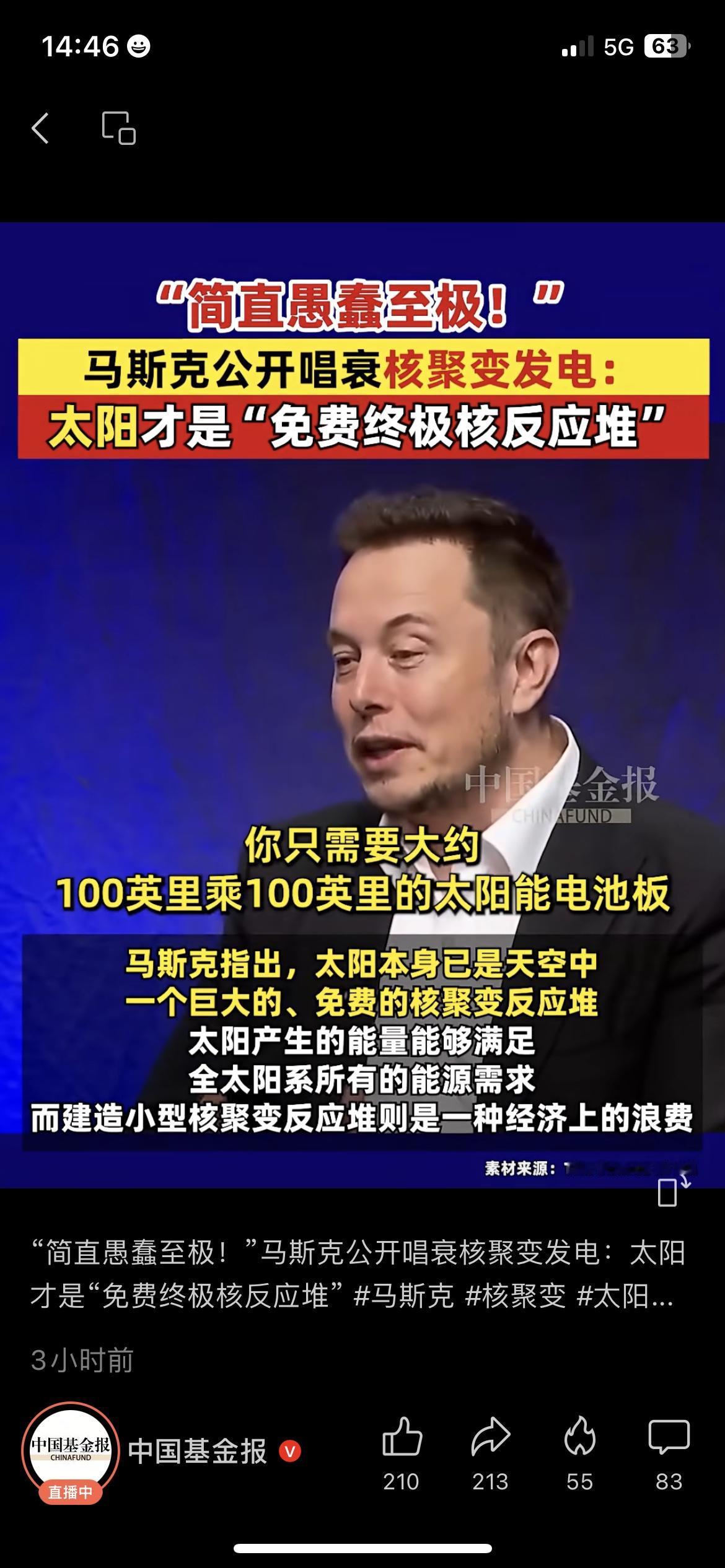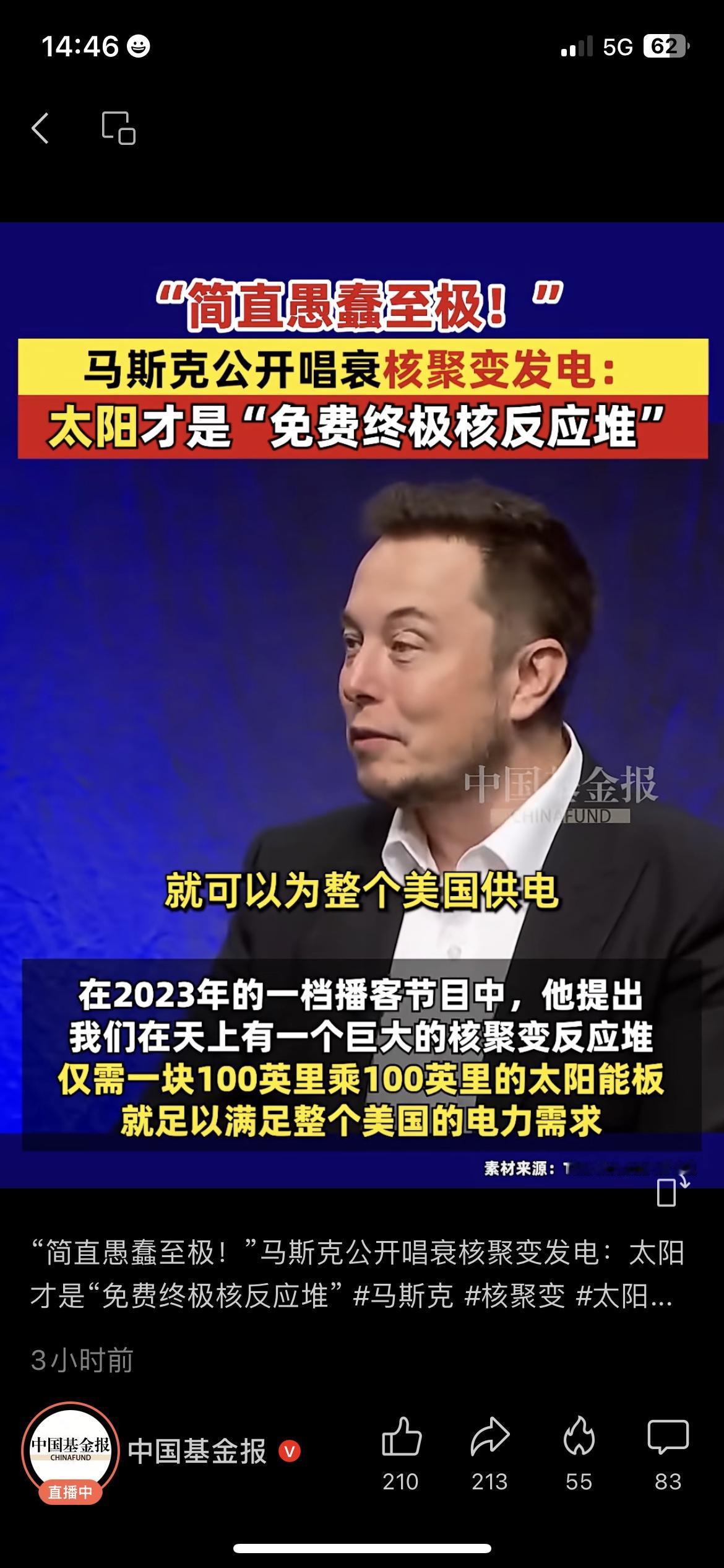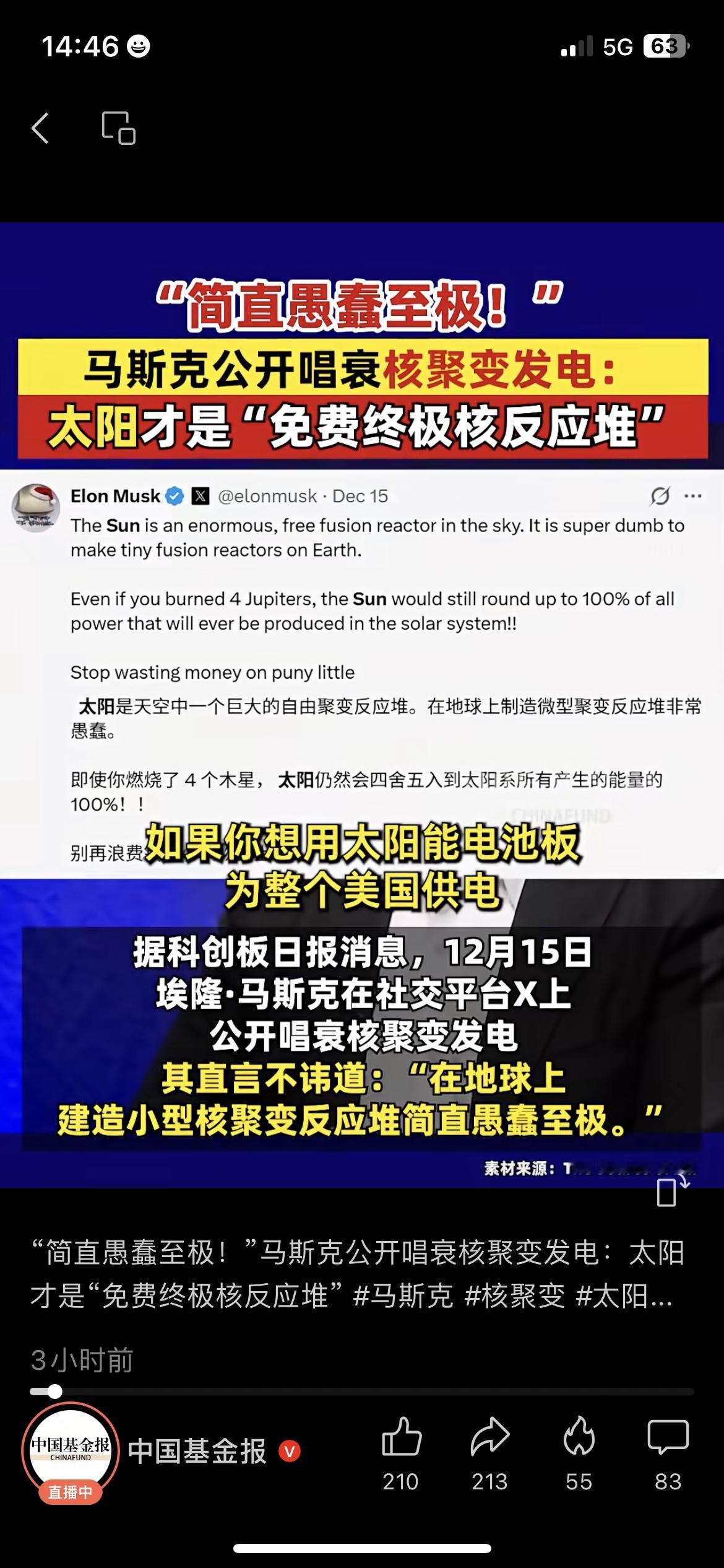 留心点!马斯克炮轰核聚变发电,太阳才是终极选择 咱关注能源话题的朋友别错过,权威渠道明确说马斯克12月15日在X上表态了! 他直言在地球造小型核聚变反应堆“愚蠢至极”,太阳才是免费的终极核聚变堆。 其实很简单,他算过一笔账,一块100英里的太阳能板,就能供整个美国用电,别浪费钱搞小反应堆。 我表哥就是能源行业的,他说这观点在业内争议挺大,不过普通人听听涨涨知识也不错。 你认同马斯克对核聚变发电的看法吗?评论区说说~核聚变产业