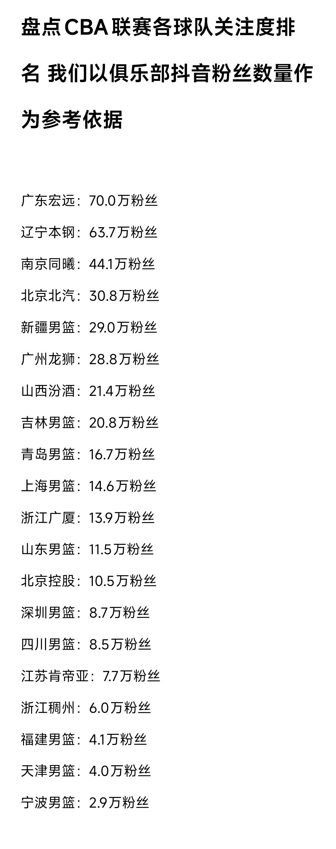 目前来看广东男篮与辽宁男篮关注度是最高的。毕竟这两支球队是我们很多球迷的青春回忆,最近几年的CBA总冠军基本上都是这两支球队包揽。 南京同曦成绩一般,并不具备争冠实力,可是这支球队的粉丝数量仅次于辽宁男篮与广东男篮,见此情景不禁感慨南京同曦是支人缘不错的俱乐部。 真正让我疑惑不解的是卫冕冠军浙江广厦与曾经打进过总决赛的浙江稠州粉丝数量排名相对靠后。以至于我思考了3夜还是疑惑不解,这样看来浙江的铁杆球迷比例还是有待提升。
