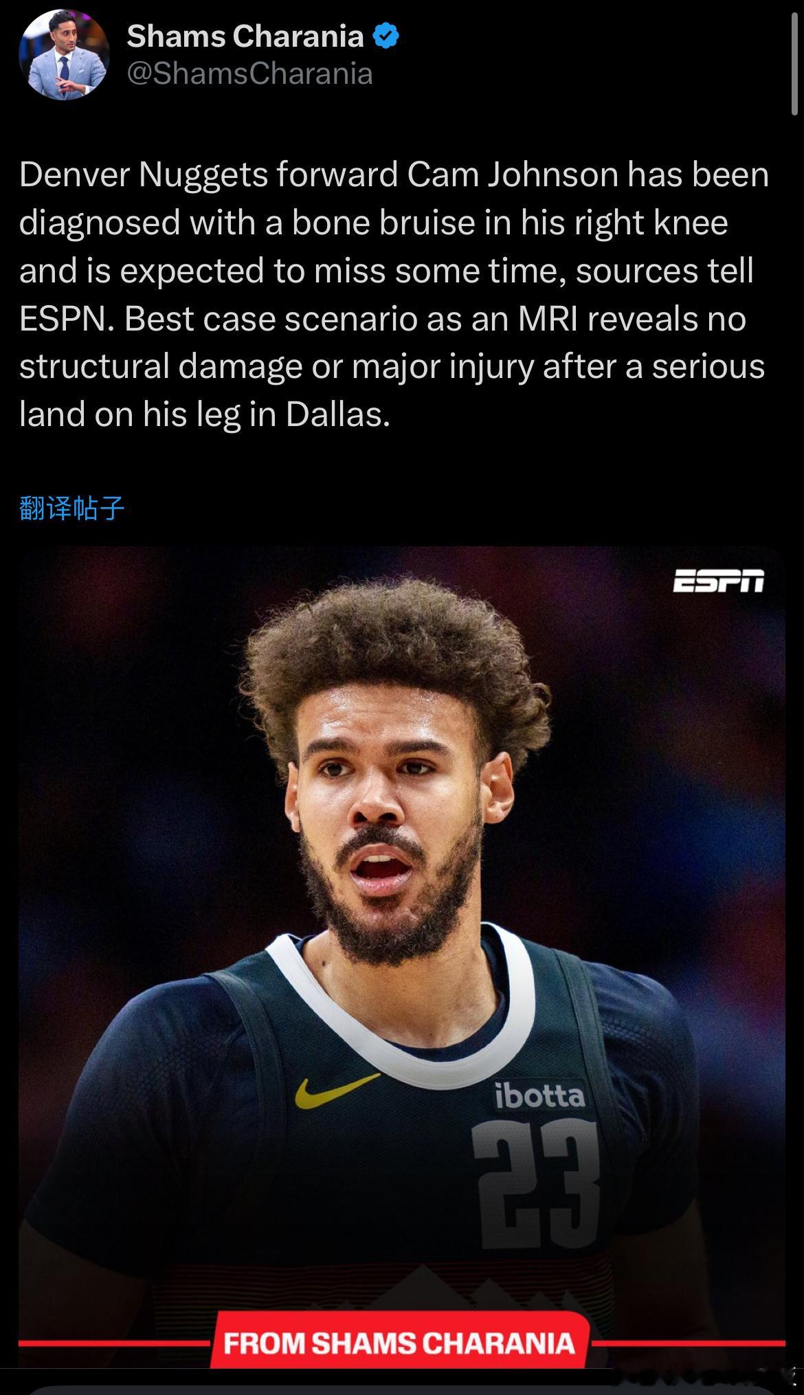 Shams:掘金队前锋卡梅伦-约翰逊被诊断为右膝骨挫伤,预计将缺席一段时间!好的方面是,核磁共振成像显示他没有造成结构性损伤或其他重大伤病。