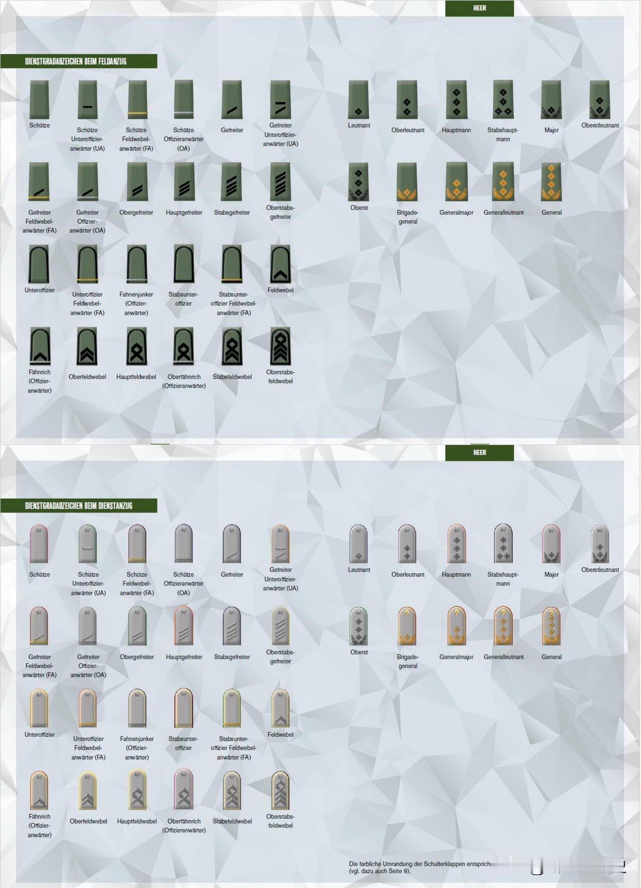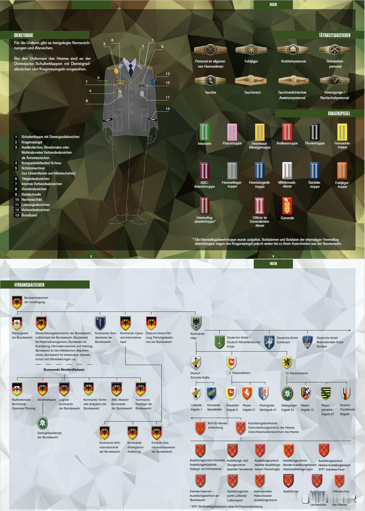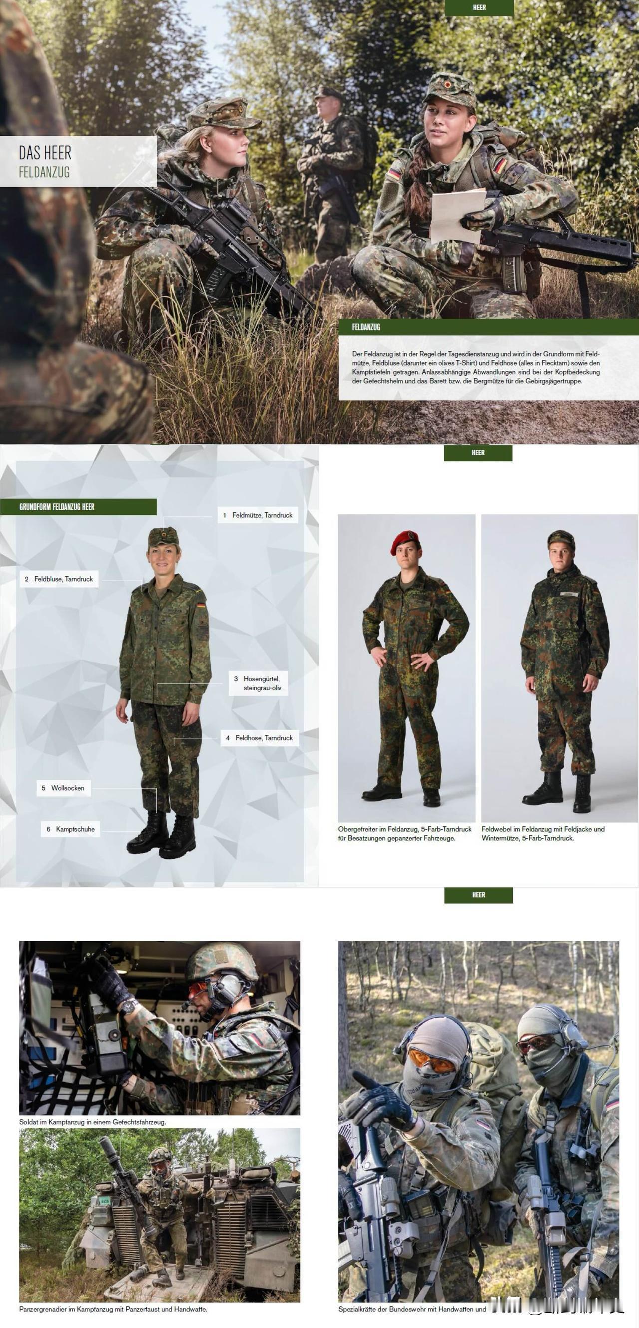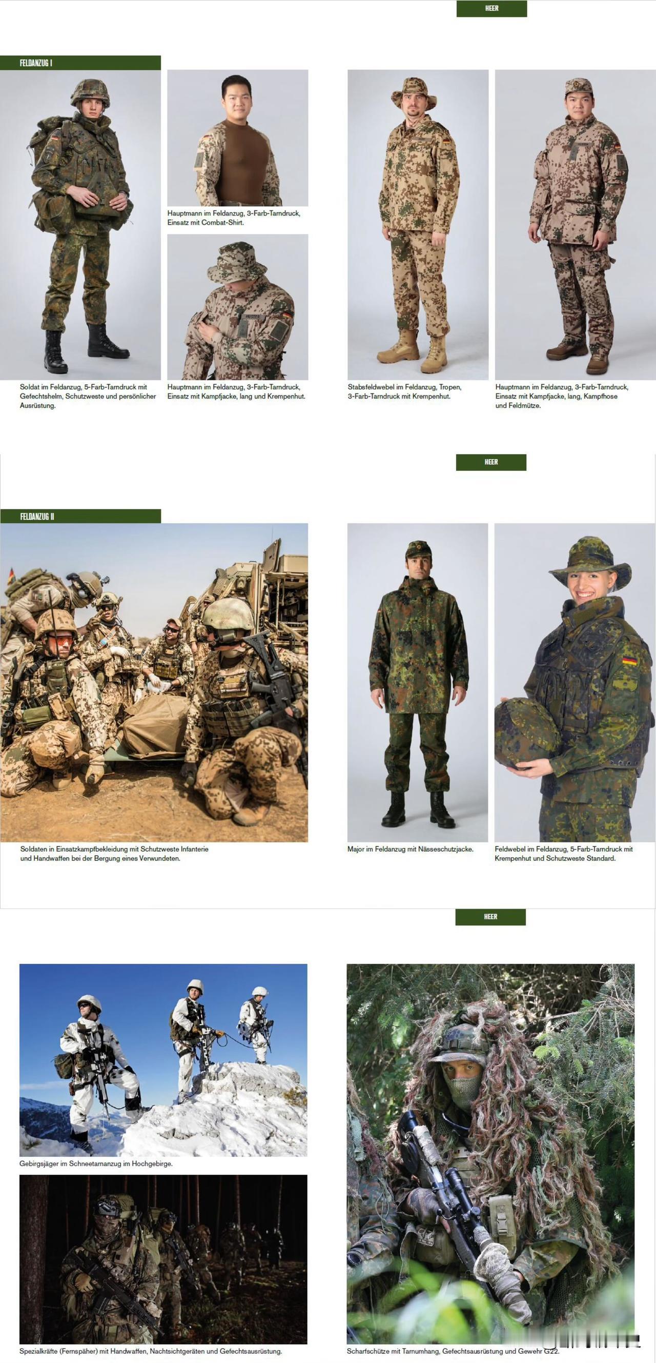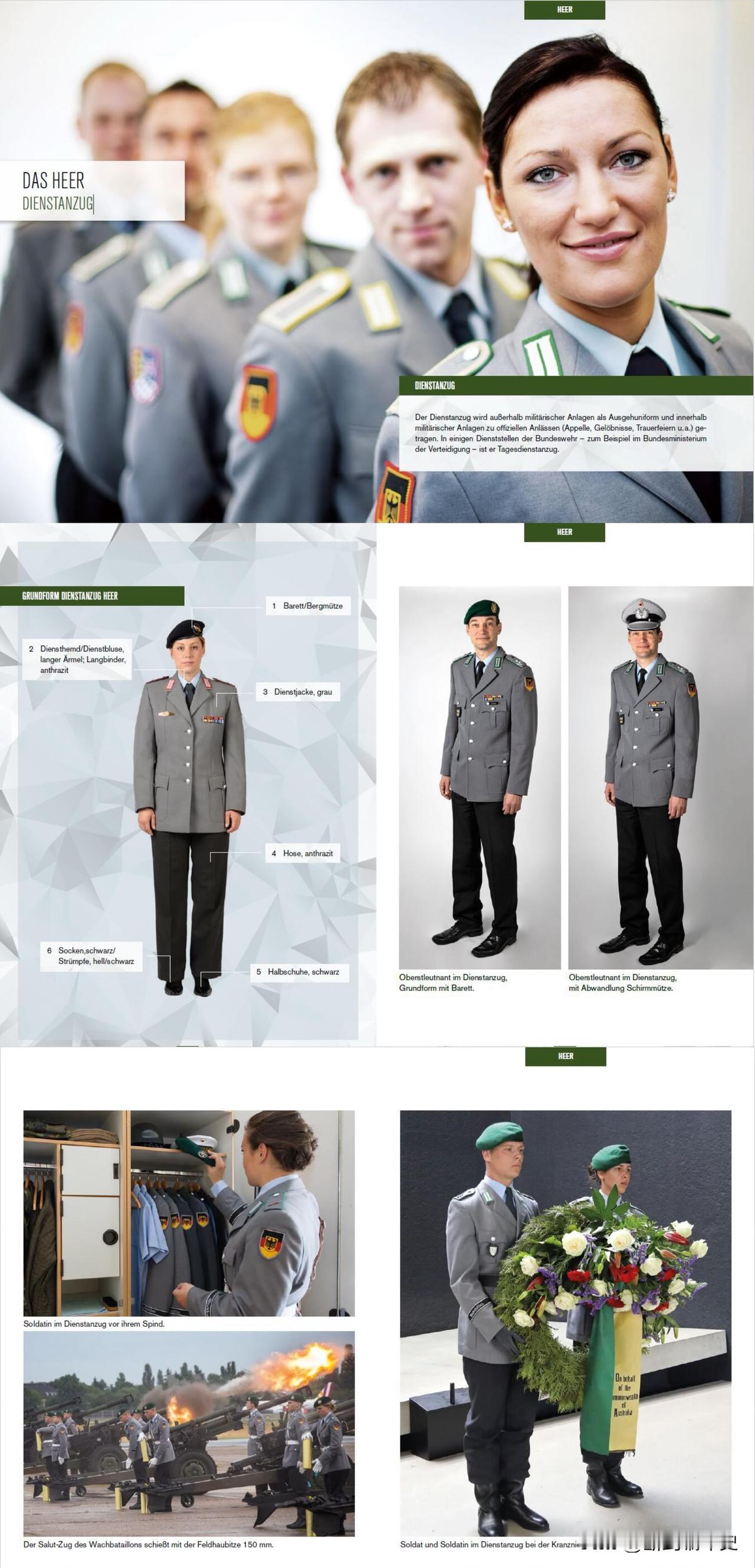 现代德意志联邦国防军的军服与纳粹时期的军服没有直接的继承或延续关系,两者在设计理念、政治象征和根本性质上存在本质区别。不过,现代军服中保留了一些更早期的、中立的德意志军事传统元素。例如,某些颜色、剪裁或配饰细节(如某些礼服款式),源于更早的普鲁士或魏玛共和国时期的军事传统,而非纳粹时期的独创设计。这些是经过“去纳粹化”筛选后的,中立的传统元素。一份2024年底的官方公告称,已委托为军队设计新的、更合身且面料优化的军常服,但不会显著改变其传统外观。 德军军服 联邦国防军 德国 军服 军事
