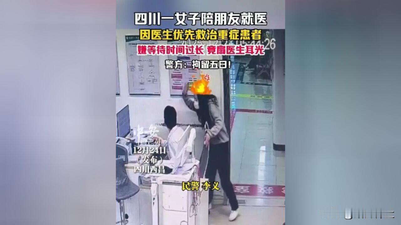 女子嫌等待时间长扇医生耳光被拘 12月24日报道,四川一女子陪朋友就医,因医生优先救治重症患者,嫌等待时间过长竟扇医生耳光。警方:拘留五