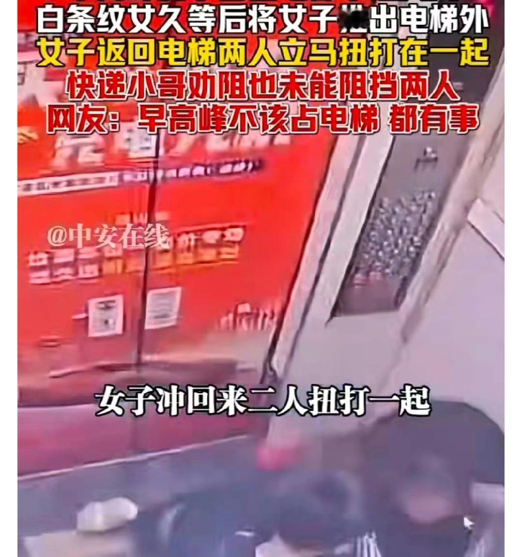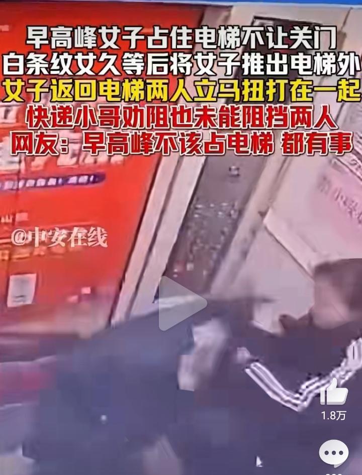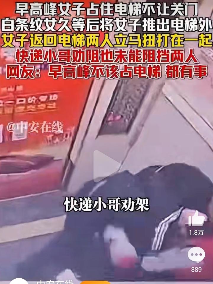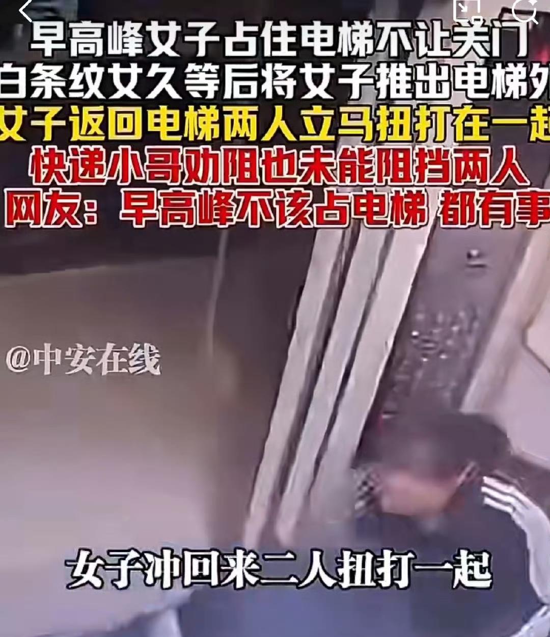 早高峰电梯冲突:女子占梯不让关 推搡扭打引热议,网友吵翻了! 12月24日早高峰,一段电梯内的冲突视频在网络引发热议。早高峰时段本就时间紧张,可一小区电梯里却上演了一出“全武行”,起因竟是有人占着电梯不让关门。 监控画面显示,一女子长时间占据电梯门口,阻碍电梯正常关门运行。同梯的白条纹女子久等不耐,直接将占梯女子推出电梯外。 本以为事情就此结束,没想到被推出的女子怒气冲冲返回电梯,两人瞬间扭打在一起,互相撕扯推搡,场面一度失控。 期间,一位快递小哥试图上前劝阻,奈何两人情绪激动,根本劝不住。 即便被快递小哥暂时分开,占梯女子仍气不过,再次对白条纹女子动手,两人又扭打在一起。最终快递小哥见劝阻无效无奈离开,留下两人继续争执,还有一位年轻人在旁淡定玩手机,仿佛置身事外。 此事在网上发酵后,网友们吵翻了天。有人认为早高峰大家都赶时间,占着电梯不让关太自私,白条纹女子的行为虽显冲动,但也是无奈之举; 也有人觉得,即便对方有错,动手推人并引发厮打也不可取,解决问题应该更理性。 早高峰的电梯资源本就紧张,每个人的时间都很宝贵。遇到此类情况,究竟是该“以暴制暴”,还是有更文明的解决方式? 这一事件也给大家提了个醒,公共空间里的互相体谅和情绪管理,真的太重要了。您觉得这事谁更理亏?早高峰遇到占电梯的情况,又该如何处理呢?地铁推搡 楼道吵架 让座冲突 电梯争议 电梯安装纠纷 北京地铁斗殴 抢座起争执 电梯风波 早高峰让座争议 地铁口角纠纷 电梯口冲突 电梯打架 电梯口对骂 电梯内殴 电梯抢座 地铁口争斗 信息来源:中安在线