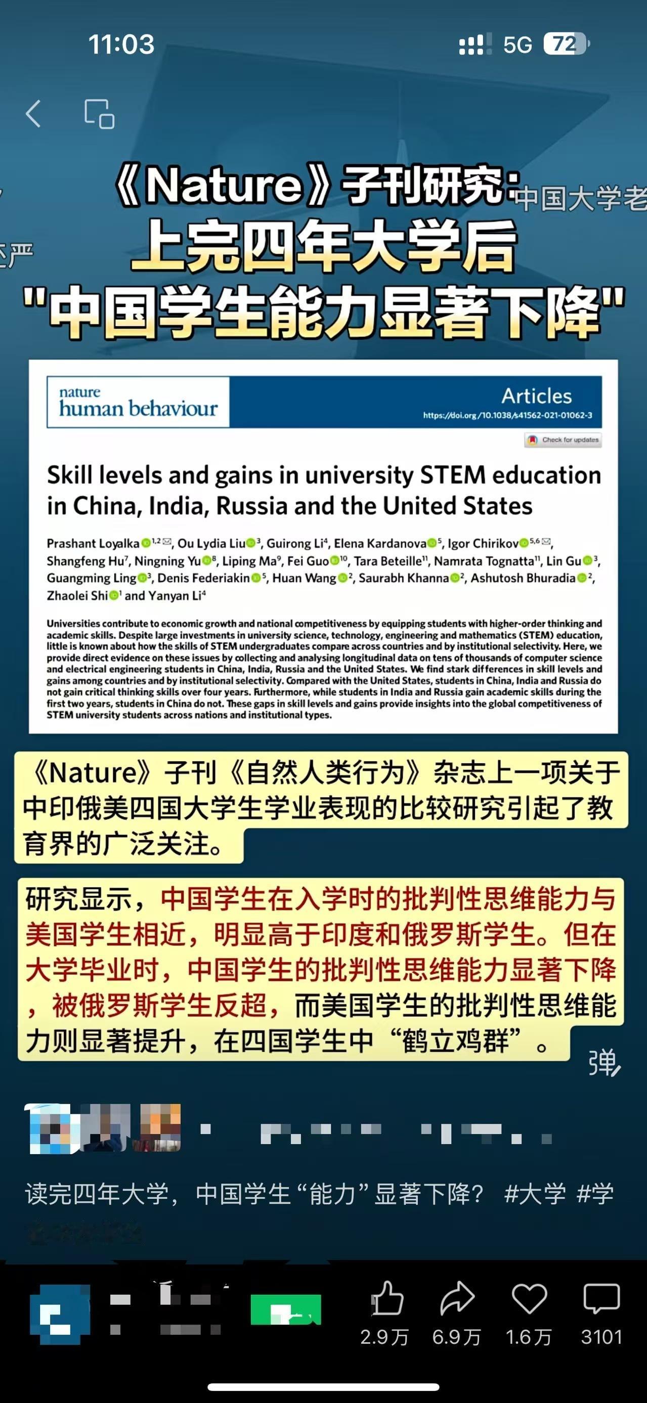 大学不能真“放养” 不管那份海外研究结论准不准,有一点大家心里都明白:不少学生一进大学,整个人就松了。旷课成常态,熬夜打游戏是日常,四年下来,别说能力提升,连原本的学习状态都退步了。这事真不能简单甩锅给学生“不努力”。 现实是,中学阶段的教育确实太“用力”了。刷题、排名、升学压力,把很多人的学习动力提前透支。好不容易考进大学,外在约束骤然消失,自然会出现强烈反弹。而过去的精英教育阶段,能进大学的本就是高度自律、有明确目标的一小撮人,放手也问题不大。但现在高等教育普及了,学生结构完全变了,还用“全靠自觉”这一套,本身就不现实。 再看大学内部,也不能装无辜。有些课程多年不更新,老师照着老PPT念,内容和社会需求脱节,学生自然提不起劲。管理上又普遍偏松,考勤、考核流于形式,等于默认“混也能毕业”。在成人社会里,只发工资不考核绩效,谁还会认真干活?同样的逻辑,指望大量年轻人在几乎零压力下高度自律,本身就是幻想。 大学当然是个人成长的重要阶段,但前提是制度要跟上。门槛降低了,过程管理就必须加强,同时教学内容要贴近现实。否则,最宝贵的四年被白白浪费,简历空空如也,受伤的不是学校的统计数据,而是学生自己的人生。