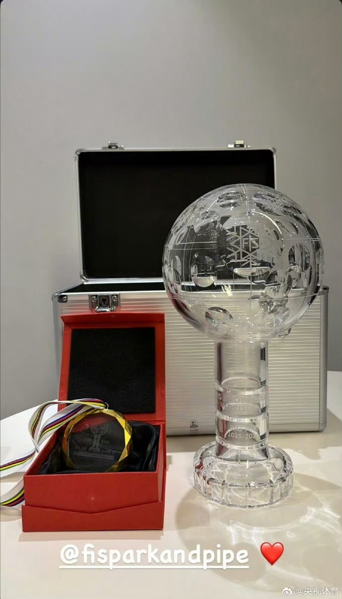 苏翊鸣晒水晶球奖杯 苏翊鸣在社媒晒出“水晶球”奖杯~!本赛季单板滑雪大跳台世界杯共计三站,苏翊鸣接连斩获云顶、北京两站金牌。他凭借统治级表现,成功加冕赛季单板滑雪大跳台世界杯总冠军。这也是中国运动员首次在男子单板滑雪领域获得年度总冠军"水晶球"奖项。