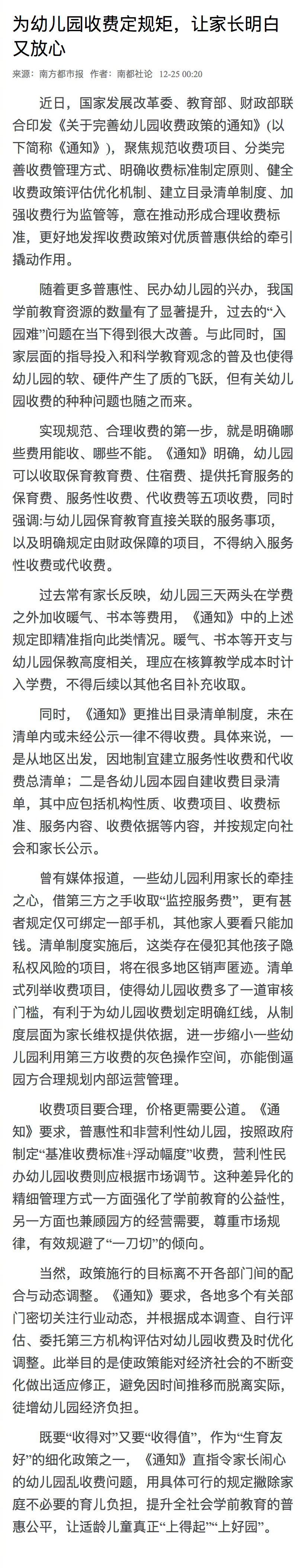 #幼儿园乱收费这次有治了#【南都快评:#为幼儿园收费定规矩让家长明白又放心#】近日,国家发展改革委、教育部、财政部联合印发《关于完善幼儿园收费政策的通知》,聚焦规范收费项目、分类完善收费管理方式、明确收费标准制定原则、健全收费政策评估优化机制、建立目录清单制度、加强收费行为监管等,意在推动形成合理收费标准,更好地发挥收费政策对优质普惠供给的牵引撬动作用。#幼儿园收费新规来了# 实现规范、合理收费的第一步,就是明确哪些费用能收、哪些不能。《通知》明确,幼儿园可以收取保育教育费、住宿费、提供托育服务的保育费、服务性收费、代收费等五项收费,同时强调:与幼儿园保育教育直接关联的服务事项,以及明确规定由财政保障的项目,不得纳入服务性收费或代收费。同时,《通知》更推出目录清单制度,未在清单内或未经公示一律不得收费。具体来说,一是从地区出发,因地制宜建立服务性收费和代收费总清单;二是各幼儿园本园自建收费目录清单,其中应包括机构性质、收费项目、收费标准、服务内容、收费依据等内容,并按规定向社会和家长公示。既要“收得对”又要“收得值”,作为“生育友好”的细化政策之一,《通知》直指令家长闹心的幼儿园乱收费问题,用具体可行的规定撇除家庭不必要的育儿负担,提升全社会学前教育的普惠公平,让适龄儿童真正“上得起”“上好园”。