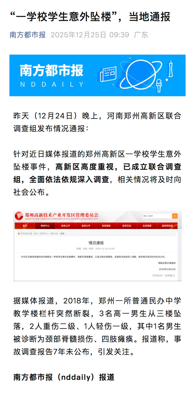 #学生坠楼事故报告7年未公布引关注#【#官方通报深入调查7年前坠楼事件#】昨天(12月24日)晚上,河南郑州高新区联合调查组发布情况通报:针对近日媒体报道的郑州高新区一学校学生意外坠楼事件,高新区高度重视,已成立联合调查组,全面依法依规深入调查,相关情况将及时向社会公布。据媒体报道,2018年,郑州一所普通民办中学教学楼栏杆突然断裂,3名高一男生从三楼坠落,2人重伤二级、1人轻伤一级,其中1名男生被诊断为颈部脊髓损伤、四肢瘫痪。报道称,事故调查报告7年未公布,引发关注。