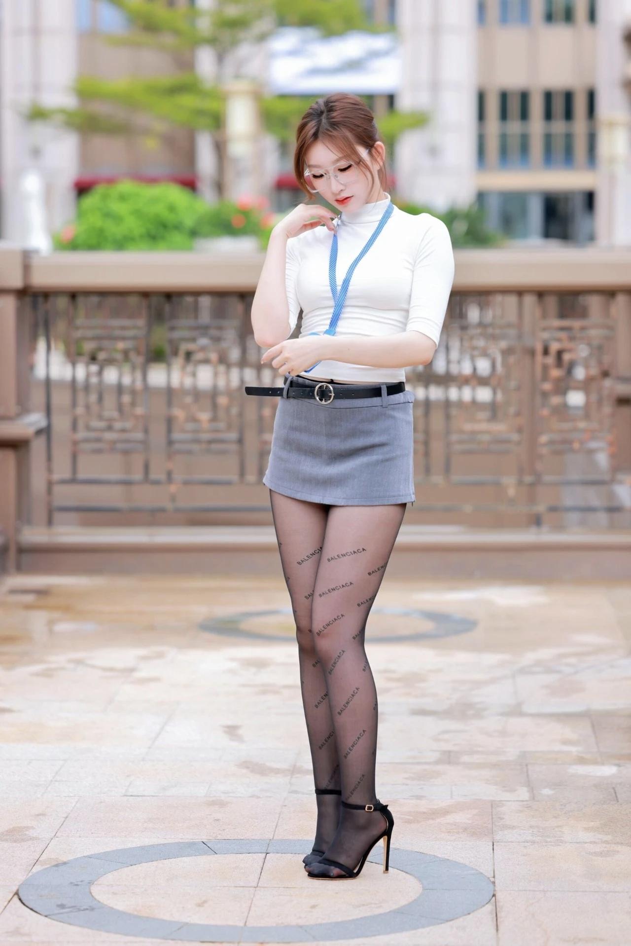 都市街头,黑丝短裙,优雅姿态,时尚穿搭