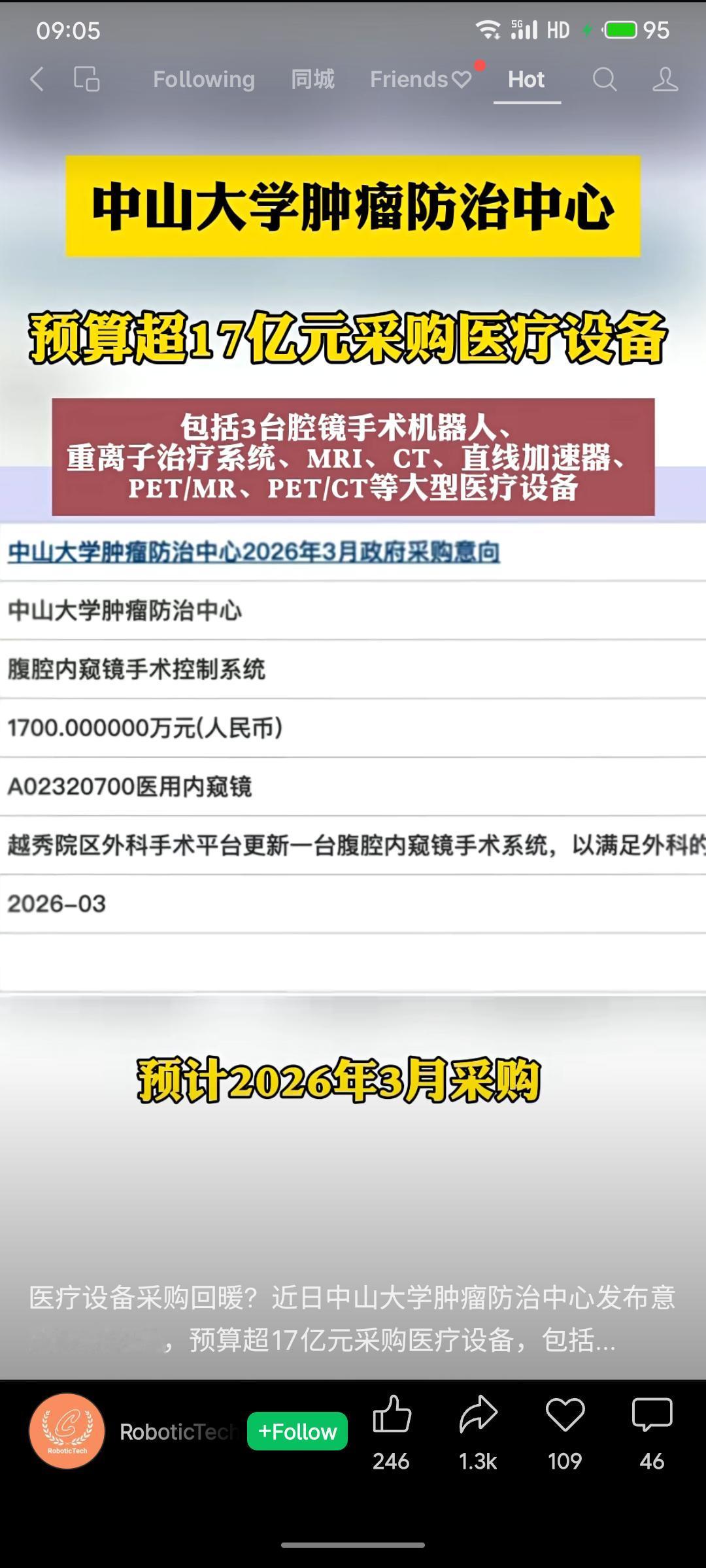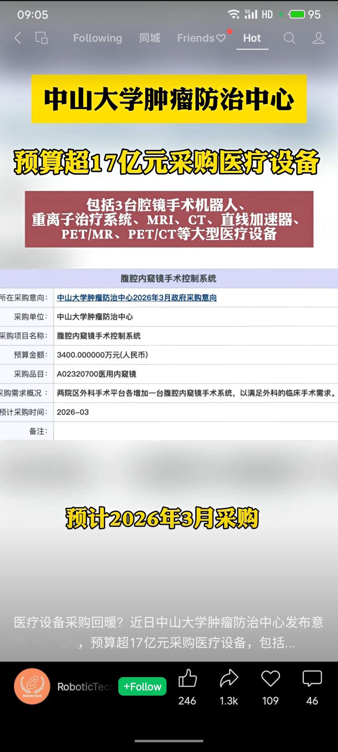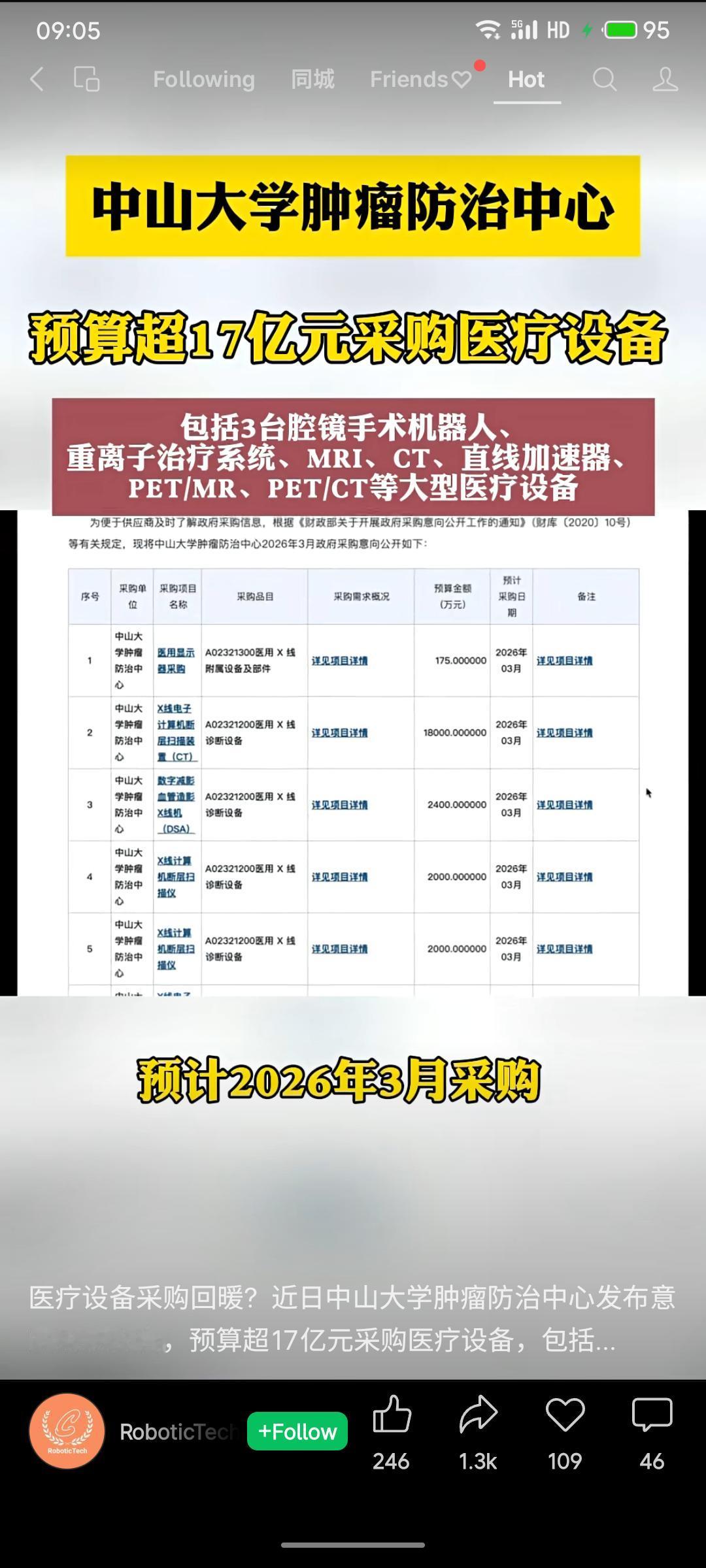 中山大学肿瘤防治中心发布2026年3月政府采购意向,预算超17亿元,计划采购包括腔镜手术机器人、重离子治疗系统等在内的大型医疗设备。