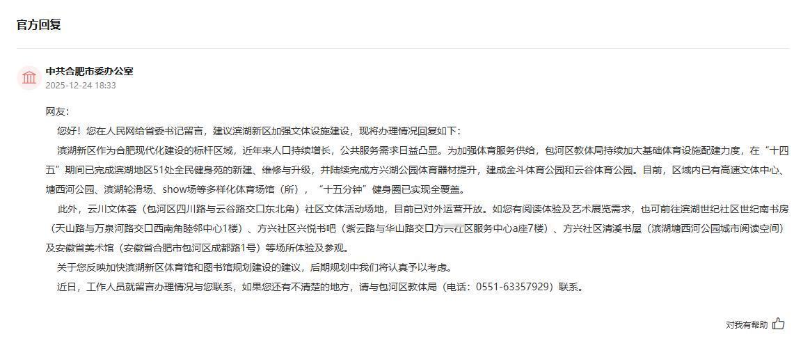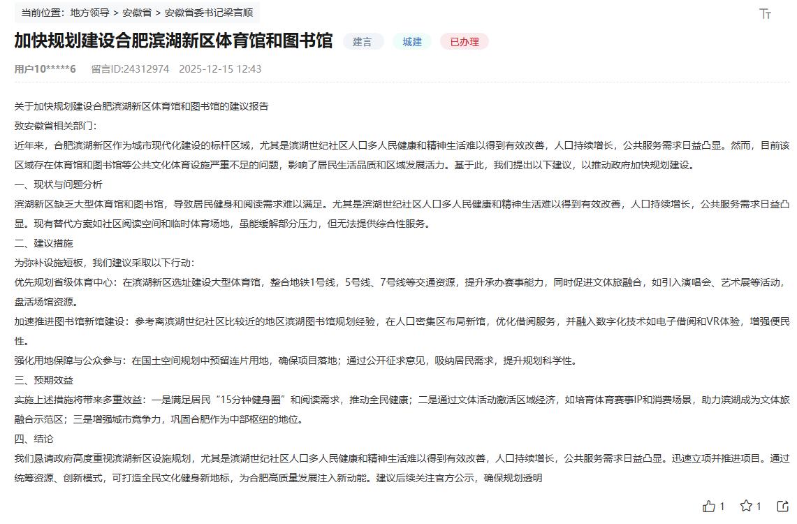 加快规划建设合肥滨湖新区体育馆和图书馆。官方回复。 说了很多,总结一下,认真考虑。 合肥的滨湖新区其实还是没发展起来,要不然现在房价变成那个样子,只是有一大片住宅,离主城区还是远了。