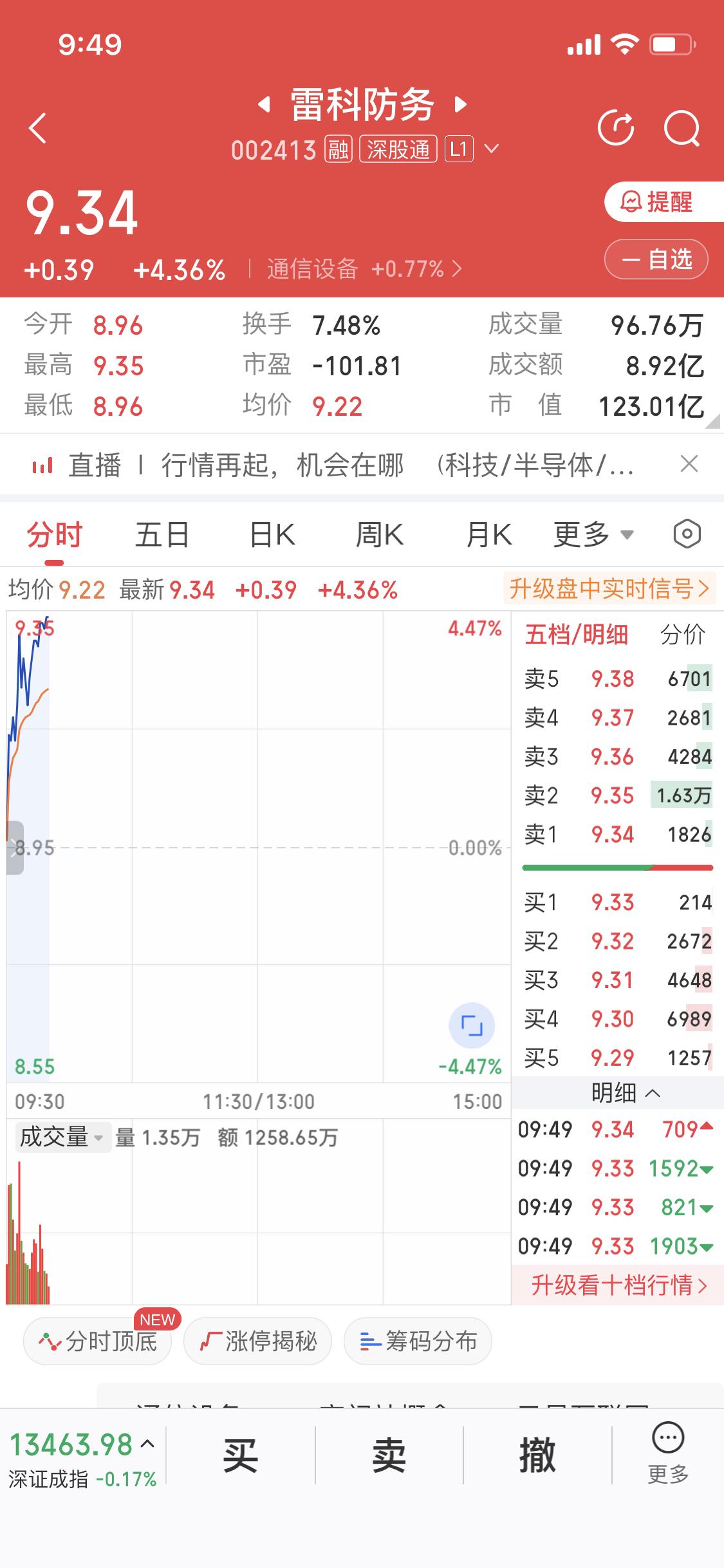 12月25日雷科防务这走势,真是让人又喜又恨。早盘直接涨了4个点,看着那曲线往上冲,心里那叫一个激动。可惜啊,我没在最低点买入。要是在“火箭发射失败”那个点买入,现在都能赚8个多点了。 就拿12月15日来说,当天涨幅达到10.03%,价格从开盘8.81元冲到了最高9.98元。再看看25日早盘,9点30分就报9.16元,5分钟内涨幅超2%,主力净流入652.59万元。这行情真是稍纵即逝,没抓住最佳买点,只能默默叹气,希望后续还有机会吧。