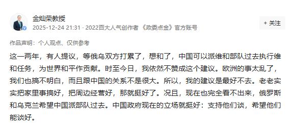 金灿荣建议: 我们自始至终都不要去染指俄乌。就在刚才,金灿荣不再含糊其辞,而是比较明确地指出,我们在实际中最好不要卷入俄乌的事情,毕竟那是属于欧洲的事务,本质上是他们内部的博弈。 过去总有人认为,中国既然是大国,就该在重大国际冲突中亮个相,帮个忙,顺带赢点人情。但金灿荣说,这种想法其实是最危险的,国际政治讲的是利益不是情分,去凑热闹不仅得不到感谢,反而可能背上锅。 俄乌冲突看似两军厮杀,背后却是欧洲几百年的历史旧账。外人插手,只会陷入泥潭,那一套“维和思维”在这里根本行不通,因为这场争端不是调解能解决的。即便有人幻想中国居中调停,以为能换取西方的好感,那也太天真,人家并不想你来撑场子,他们只想让你站队。 从战略和战术角度看,无论介入后结局好坏,对中国而言意义都不大,哪怕劝和真的见了效,格局也不会因此改变。 更何况,咱们自己周边的局势就已经够复杂,从南海到台海处处是雷,把精力花在别人家的战火上,既耗资源又无回报,还可能牵连自身。此时最明智的做法,就是稳住自己的节奏,守好自己的家门。 战争这种事,外人干预不了。他们要打,谁劝也没用,该做的,就是保持冷静,坚持一贯立场——希望他们谈,但不替他们决定。过度的热心往往会演变成被动的风险,大国更需要的是克制和定力,而不是逞一时的好心。 金灿荣最终的落点在于,把心思放回自己身上。比起在欧洲的局势里耗神,我们有更多值得投入的地方,科技突破、经济转型、社会稳定,每一项都关乎根本。国家若是强到足以让别人顾忌,自然不需要靠介入战争去证明地位。 一句话,俄乌是欧洲的纠纷,我们在旁边看清形势就行。真正的智慧,是不被噪音带节奏,静下心发展自己的力量。只有自己强大了,别人的战火,才能烧不到这片土地。