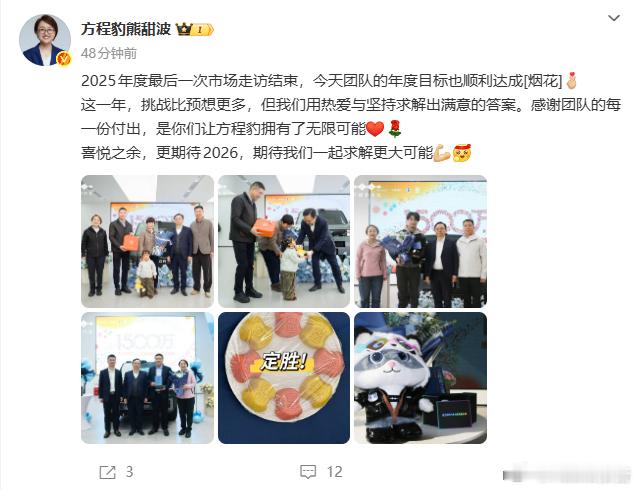 比亚迪方程豹完成2025年销量目标12月24日,比亚迪方程豹顺利达成2025年销量目标。方程豹总经理熊甜波发文庆祝:“2025年度最后一次市场走访结束,今天团队的年度目标也顺利达成。这一年,挑战比预想更多,但我们用热爱与坚持求解出满意的答案。”汽场全开比亚迪方程豹汽车