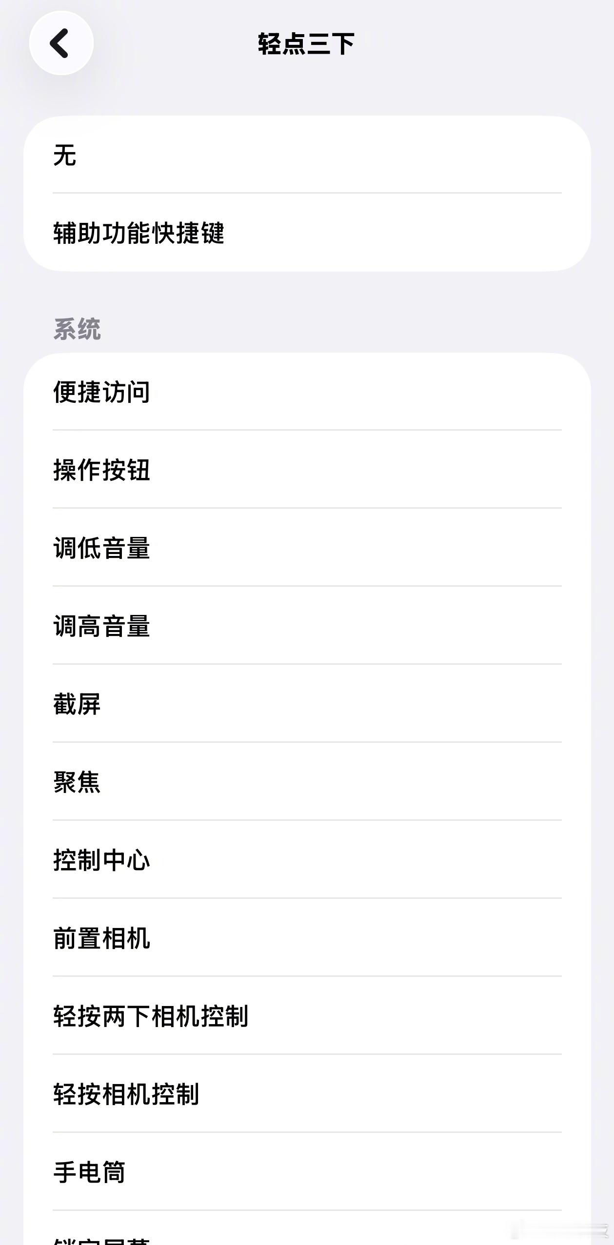轻点手机背面可实现截屏等功能。具体步骤:「设置」-「辅助功能」-「触控」-「轻点背面」。建议设置轻点三下,轻点两下容易出现误操作。iPhone的背面有隐藏按键