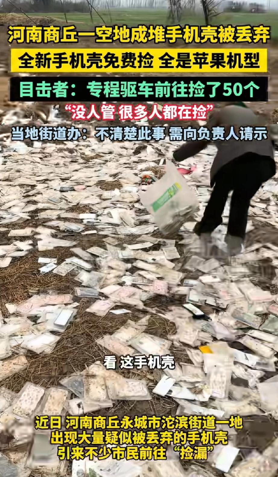 这些无人管理的手机壳,到底能不能捡? 近日,河南商丘永城市沱滨街道突然出现,大量疑似被丢弃的手机壳,多为全新未拆封的苹果机型适配款,吸引不少市民前往,对此,当地街道办回应称不清楚此事,需向负责人请示。 不知道是谁扔的,也没人管,捡了怕有问题,不捡又觉得可惜。你们觉得捡不捡?