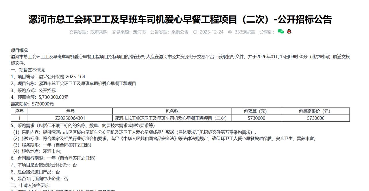 漯河市总工会环卫工及早班车司机爱心早餐工程项目(二次)-公开招标公告,预算573万元