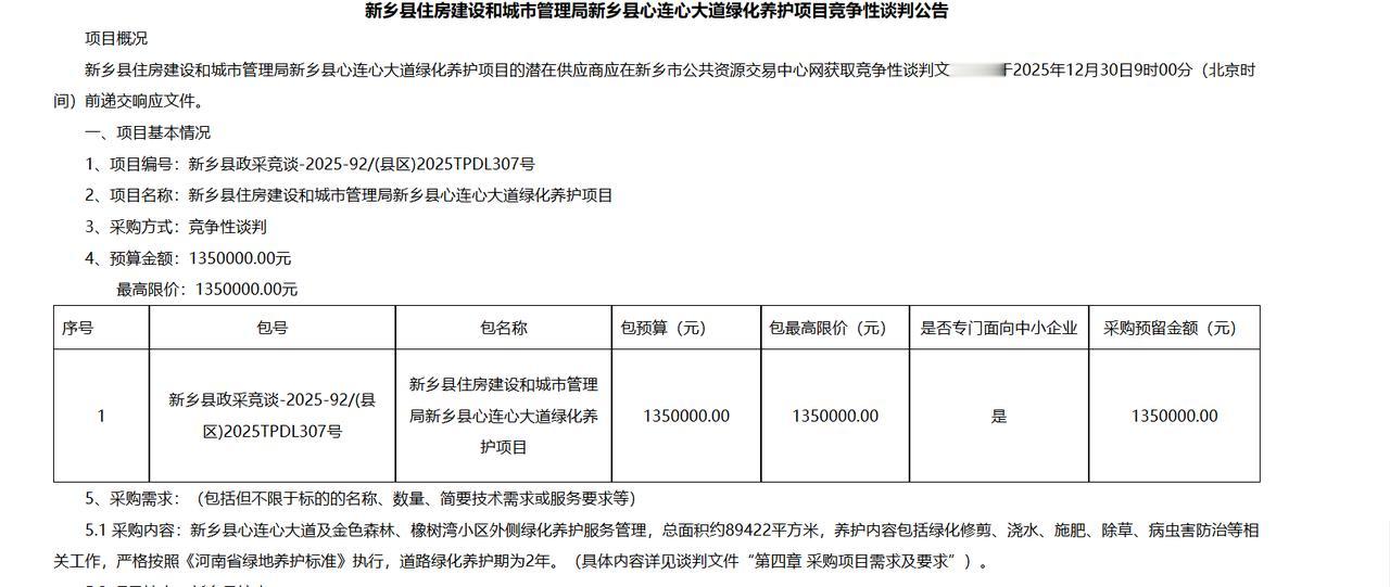 新乡县心连心大道绿化养护项目竞争性谈判公告,预算135万元