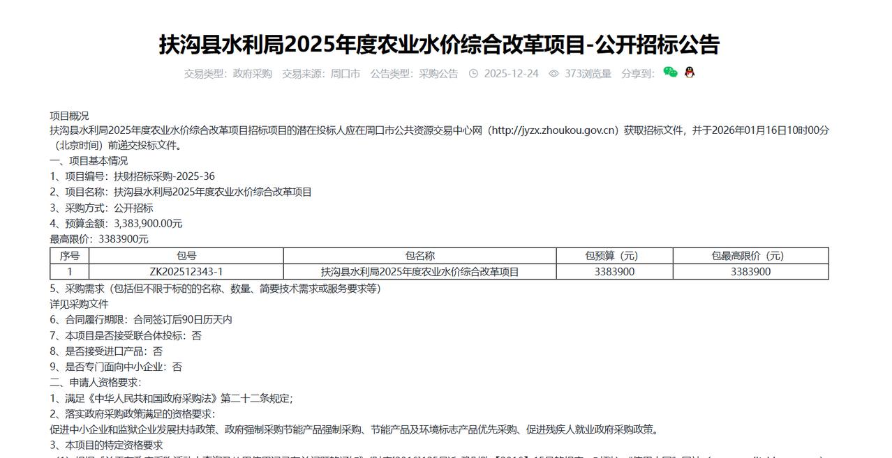 扶沟县水利局2025年度农业水价综合改革项目-公开招标公告,预算338万元