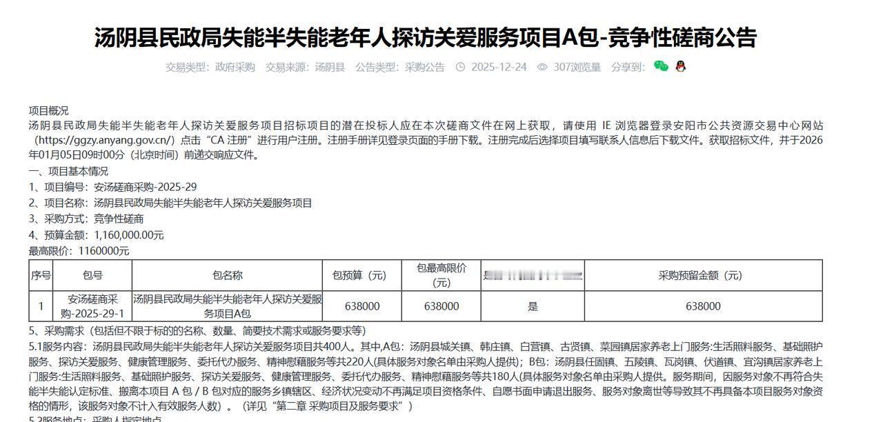 汤阴县民政局失能半失能老年人探访关爱服务项目A包-竞争性磋商公告,预算63.8万
