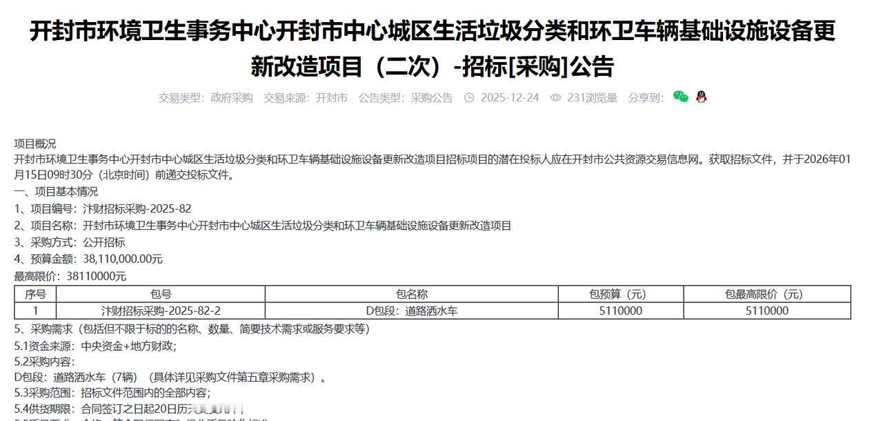 开封市中心城区生活垃圾分类和环卫车辆基础设施设备更新改造项目(二次)-招标[采购]公告,金额511万元