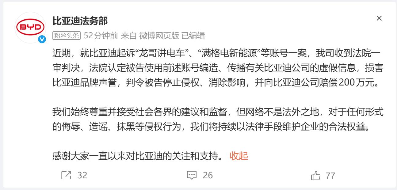 比亚迪法务:近期,就比亚迪起诉“龙哥讲电车”、“满格电新能源”等账号一案,我司收到法院一审判决,法院认定被告使用前述账号编造、传播有关比亚迪公司的虚假信息,损害比亚迪品牌声誉,判令被告停止侵权、消除影响,并向比亚迪公司赔偿200万元。看了一眼这个“龙哥讲电车”的视频,很多条视频开口第一句话就是“不让你买比亚迪,你非得买,电池包经常出问题”“不让你买比亚迪非得买,这辆比亚迪秦才跑20万公里,看起来咔咔响,减速器坏了”“比亚迪就是好,才跑了十几万公里,电控就炸了”“开比亚迪是真危险,电池包漏电,差点电到人”“比亚迪的荣耀系列千万不要买”之前看到这个哥们说被小鹏告了,在那哭诉,我大致看了一部分内容,感觉还行啊,但没看到上面我摘录的这些内容从摘录的这些内容,他视频的旁白,光这个旁白写出来,就够他吃官司了。这样的用词明显违法了,有些用词跟集车的性质差不多,过头了。比亚迪判他200万,不冤。