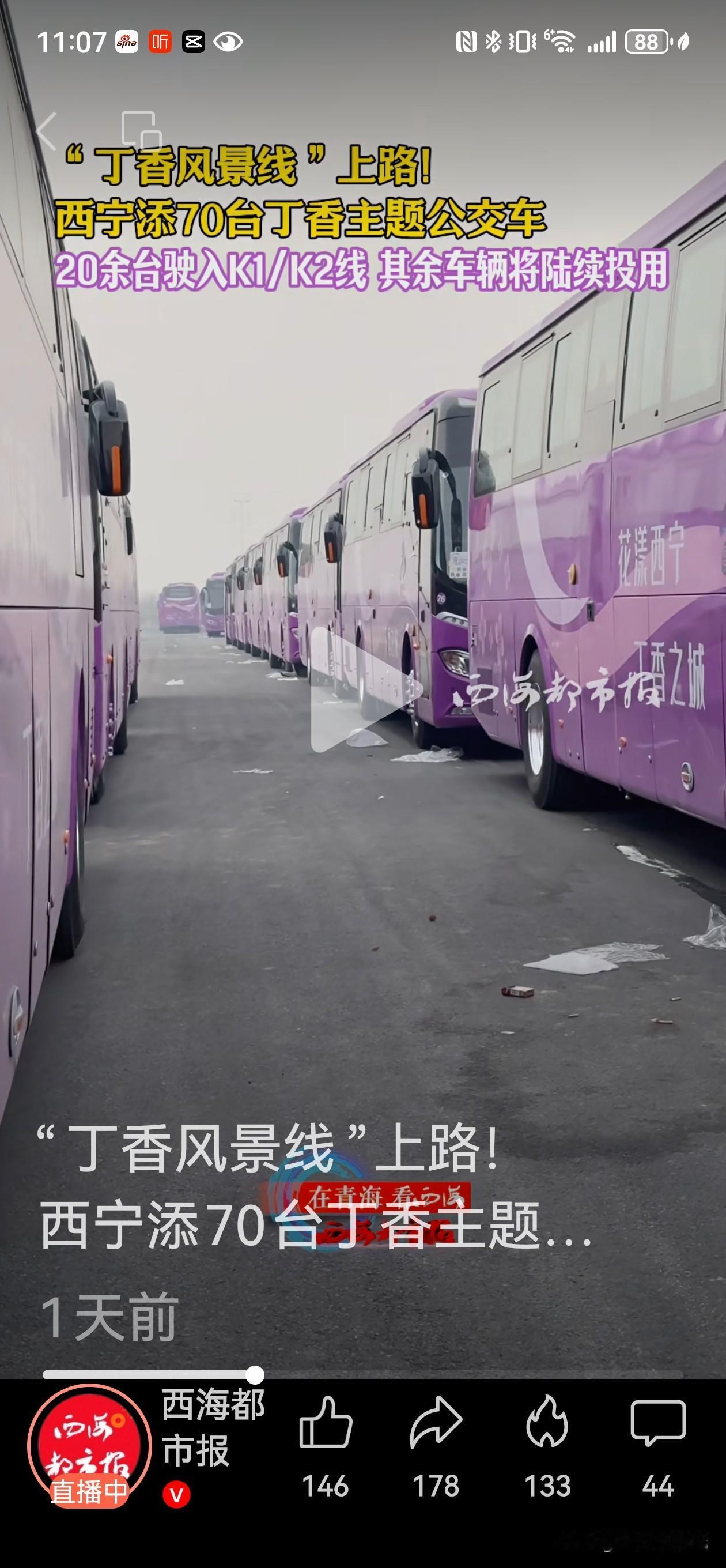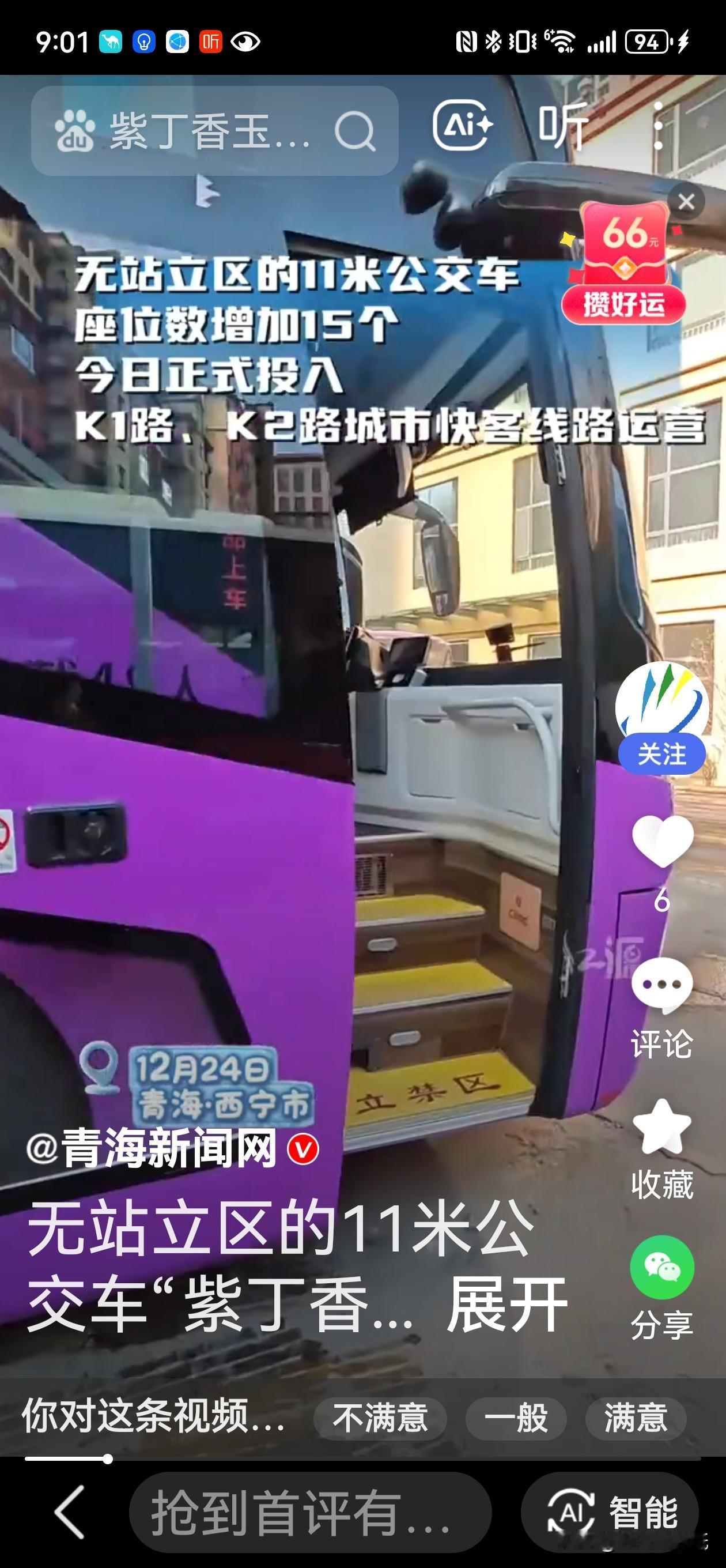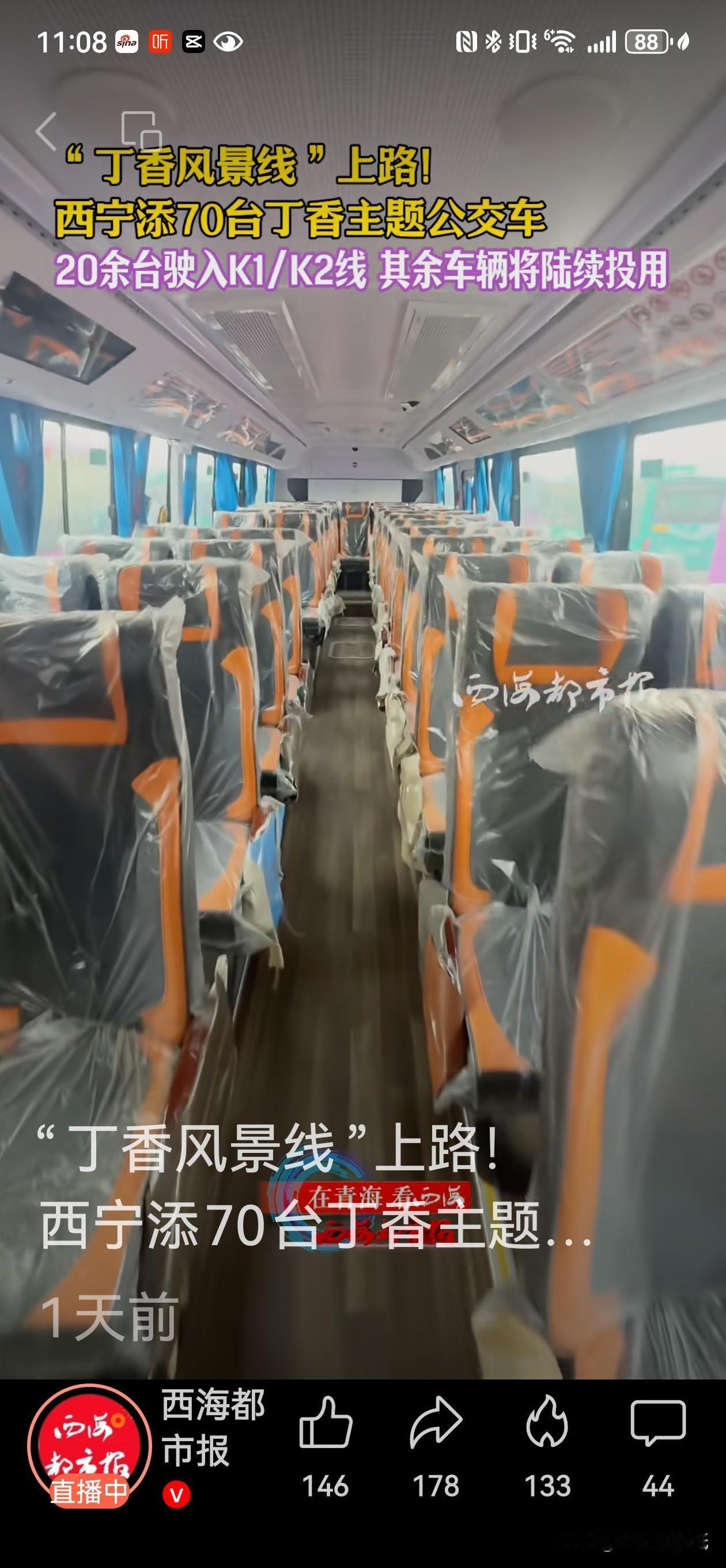 西宁“丁香”公交上新!无站立区新车带你“坐着公交去旅行”! 昨天(12月24日),西宁街头一道“丁香紫”风景刷屏了!全新11米纯电动公交车正式在K1、K2两条城市快客线路上开跑。这次的新车不一般——它是西宁首批“无站立区”公交,车里不设扶手,满眼都是座椅。 全都坐着,安全感拉满,新车采用全座位设计,一共47个座椅,每个座位都配了安全带。这不仅让座位数比原来多了大约15个,运载能力更强,更重要的是,它符合高速公路行驶标准,安全升级,坐着公交跨区通行更踏实。 智能又舒适,司机乘客都轻松,这车还是个“聪明”的大家伙。它配备了5G智能驾驶舱和AEB自动紧急制动系统,能有效提升行车安全和效率。连驾驶员的座椅都有“记忆”,能智能识别不同司机的习惯,缓解长时间驾驶的疲劳。 紫色新车背后的绿色大计划。这款丁香花紫色的新车,其实是西宁今年大规模公交更新中的一环。就在本月,西宁已有286台纯电动新车跑在了20条线路上。而到年底,今年新购的总共450台纯电动公交车将全部投运,届时西宁公交将实现100%纯电动化。 公交车,成了城市名片。西宁的公交车,不只是交通工具。车身迷人的丁香紫色,和此前大量应用的“雪豹”元素一样,是西宁精心打造的城市名片。它们让“雪豹之都,丁香之城”的故事,随着车轮的滚动,流淌在城市的大街小巷。 从绿色纯电到文化赋能,西宁的公交车,正成为一座城市向前奔跑的生动注脚。