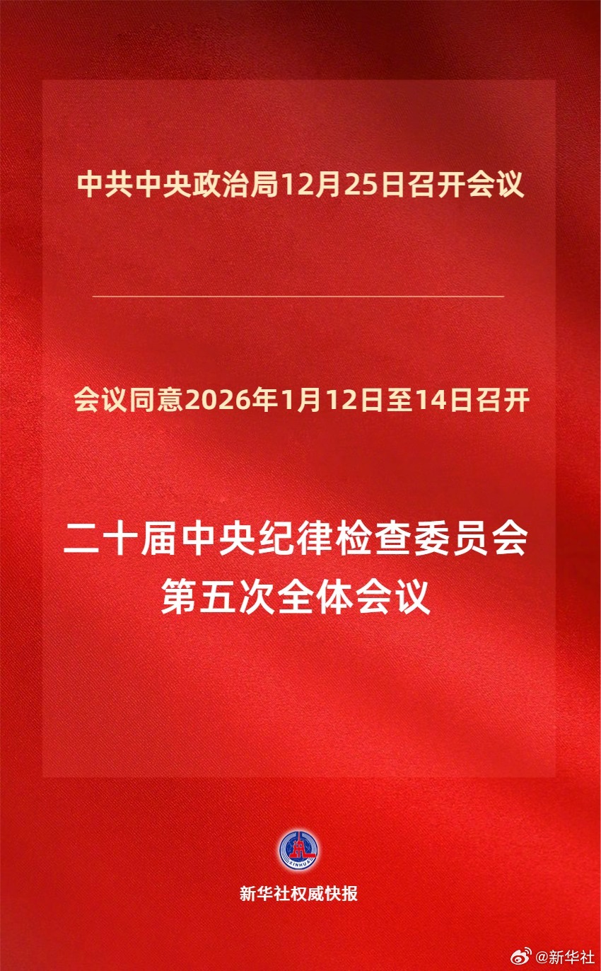 #二十届中央纪委五次全会#【新华社权威快报|二十届中央纪委五次全会将于2026年1月12日至14日召开】#二十届中央纪委五次全会2026年1月12日至14日召开# 中共中央政治局12月25日召开会议,会议同意明年1月12日至14日召开二十届中央纪律检查委员会第五次全体会议。