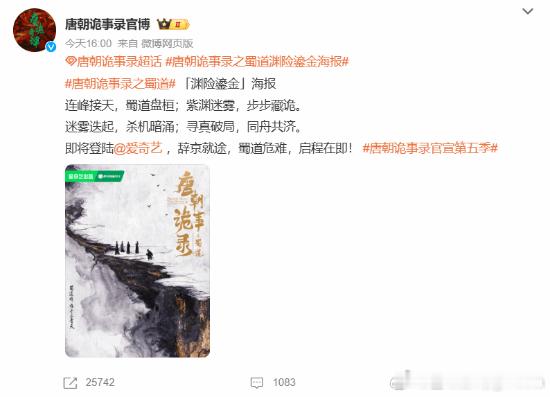 《唐朝诡事录》第五季官宣《唐诡》官博突然“空降”重磅炸弹,正式官宣系列第五季——《唐朝诡事录之蜀道》投入制作,并同步公开了首张「渊险鎏金」版概念海报!这一消息标志着这部“国产志怪悬疑天花板”的作品将继续拓展其大唐宏大版图。从官宣文案来看,第五季的主战场将转移至奇险瑰丽的巴蜀之地:“连峰接天,蜀道盘桓;紫渊迷雾,步步藏诡。”预告了这一季将围绕奇险的蜀道展开。官方强调“寻真破局,同舟共济”,意味着卢凌风与苏无名这对“大唐最强探案CP”将再次携手。《唐朝诡事录》自开播以来,便凭借扎实的剧本和精良的制作在观众中积累了极高口碑。翻看历代成绩单,堪称惊人:前三季豆瓣评分分别为 8.0分、8.6分、8.0分。在续集往往容易“烂尾”的影视圈,该系列保持了极高的品控稳定性。目前第四季《唐诡奇谭》虽暂未开分,但讨论度居高不下。而第五季的紧锣密鼓官宣,足见制作方对该IP长线经营的野心。