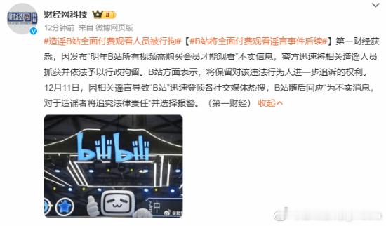 造谣B站全面付费观看人员被抓获:依法行拘12月11日,一张关于B站(哔哩哔哩)致用户的截图在网络流传。截图内容称,“自2026年3月1日起,哔哩哔哩平台所有视频类资源均需购买B站视频会员方可完整观看,基础弹幕功能同步绑定会员权益开放。”当日就有客服辟谣,称为不实消息,对于造谣者将追究法律责任。据第一财经报道,因发布“明年B站所有视频需购买会员才能观看”不实信息,警方迅速将相关造谣人员抓获并依法予以行政拘留。B站方面表示,将保留对该违法行为人进一步追诉的权利。