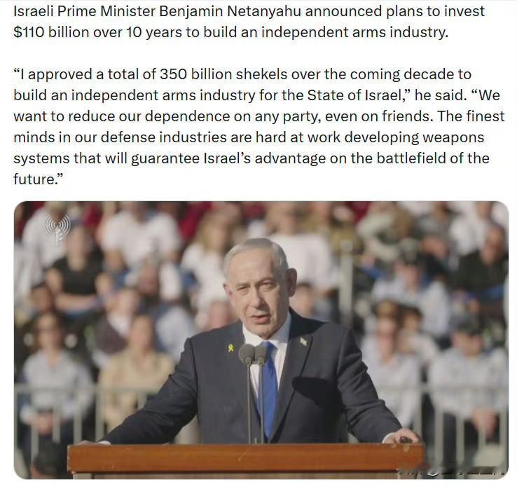 以色列总理内塔尼亚胡宣布了一项计划:将在未来10年投资1100亿美元,打造一个独立的国防军工产业体系。 他说:“我已批准在未来十年内总计3500亿谢克尔,用于为以色列国建设一个独立的武器工业。我们希望减少对任何一方的依赖,即便是对朋友的依赖。我们国防工业中最顶尖的人才,正在全力研发各类武器系统,以确保以色列在未来战场上保持优势。”