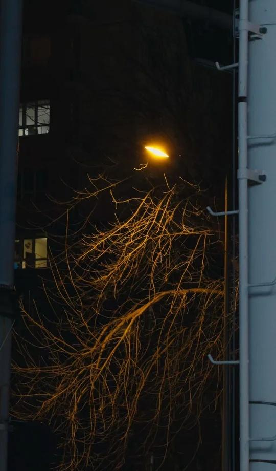 昨晚的路灯,树上的光斑 抬头看艺术 昏黄的路灯 夜晚的风景 会发光的树 黑夜的一束光 凌晨的街道