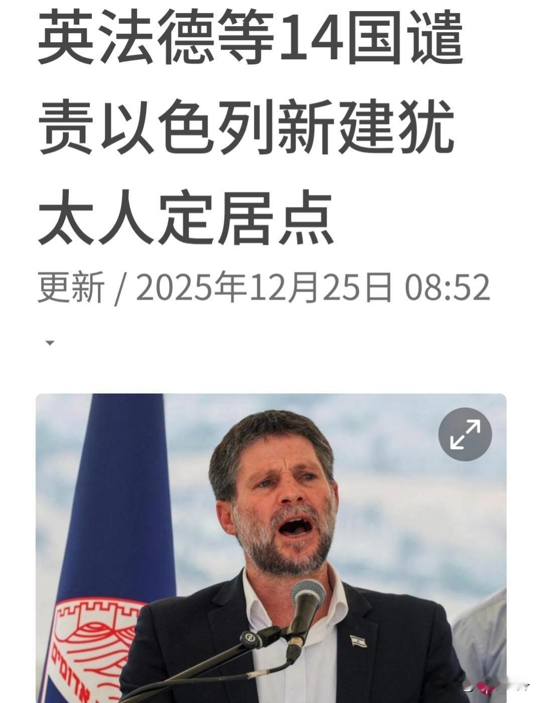 14国齐声谴责,以色列硬刚到底,中东年末再添乱 圣诞前一天,英法德等14国突然联手发声,炮轰以色列在约旦河西岸新建19个犹太人定居点,直指这是违反国际法的“殖民操作”。没想到以色列反手硬刚,外长直接怼“外国无权干涉”,态度蛮横得很。 这波操作绝非偶然。2025年以伊冲突后,以色列看似占优,实则国际形象跌到底,西方盟友也扛不住民意压力划清界限。定居点扩张说白了就是要堵死“两国方案”,把巴勒斯坦逼到墙角。 往后看,中东只会更乱。以色列越孤立越激进,伊朗虽遭重创但导弹威慑还在,阿拉伯国家也在重新站队。没有对话只有对抗,这片土地的和平,恐怕还得在炮火中慢慢等。