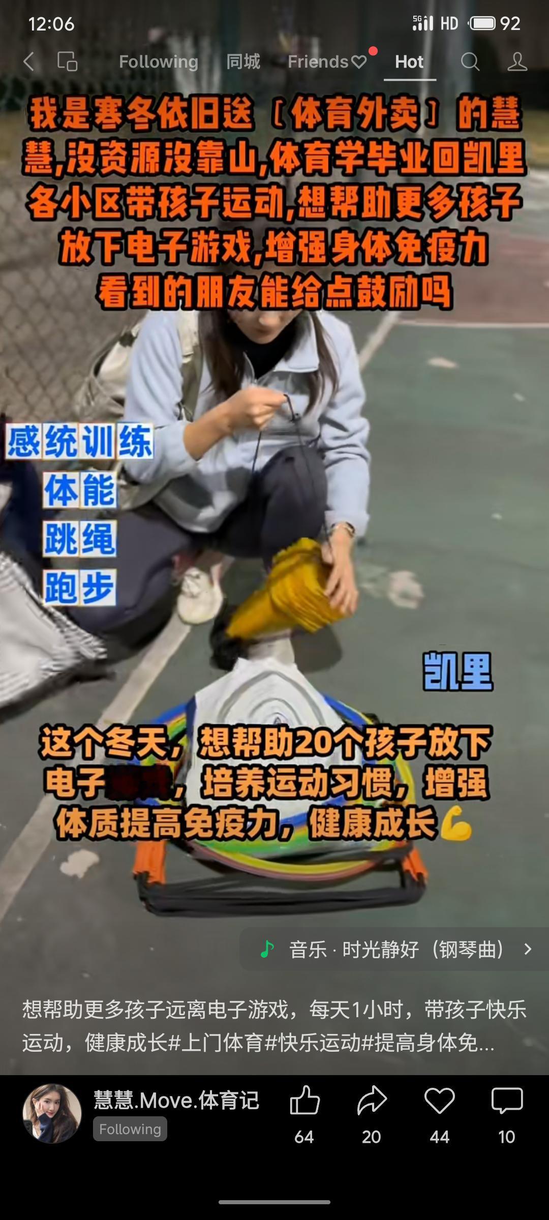 体育专业毕业的慧慧回到社区,发起“体育外卖”公益项目。她计划帮助20个孩子每天运动1小时,通过体能训练、跳绳、跑步等方式,引导他们远离电子游戏,增强体质、培养运动习惯,促进健康成长。