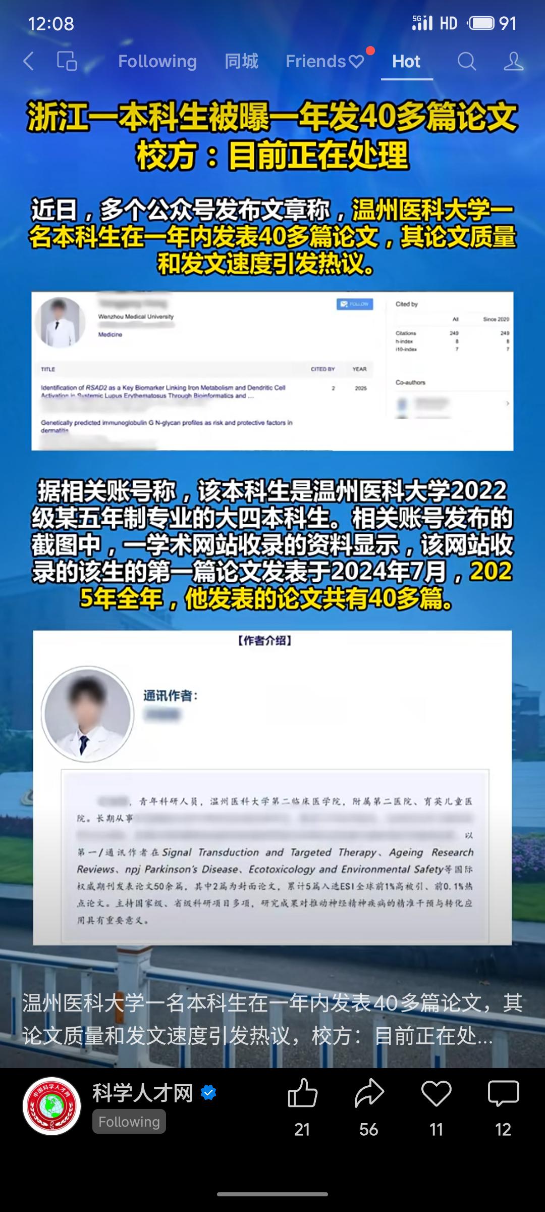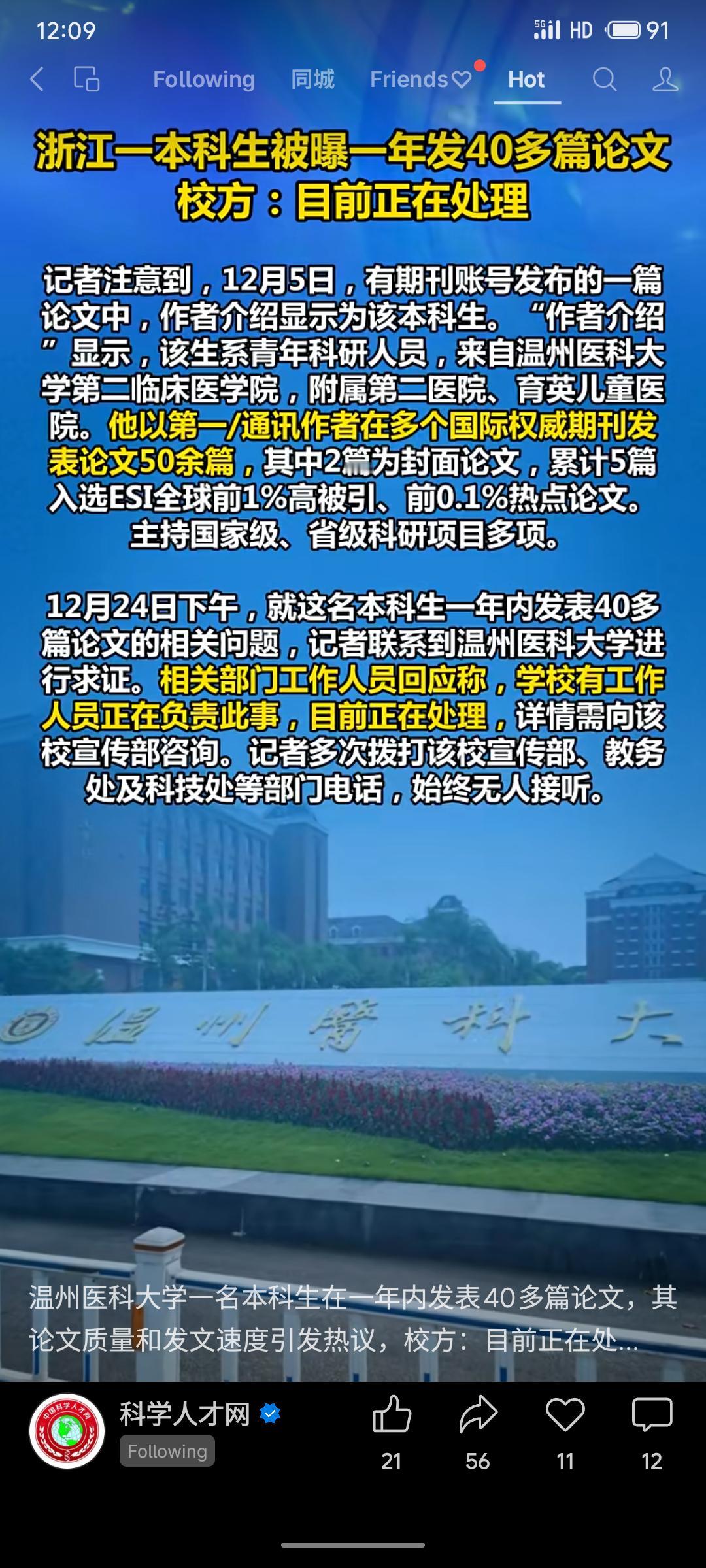 温州医科大学一名本科生被曝一年内发表40多篇论文,作者简介称其以第一/通讯作者身份发表论文50余篇,部分入选ESI高被引论文。事件引发对论文质量与发表速度的质疑,校方回应称正在处理中。