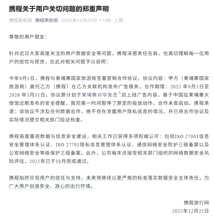 【#携程回应与柬埔寨旅游局合作#,#携程称与柬埔寨合作绝不涉及数据# 】12月25日,“携程黑板报”发布关于用户关切问题的郑重声明,称针对近日大家高度关注的用户数据安全等问题,携程深感责任在肩,也真切理解每一位用户的担忧与顾虑,在此对相关问题予以说明:今年9月1日,携程与柬埔寨国家旅游局签署营销合作协议。协议内容:甲方(柬埔寨国家旅游局)委托乙方(携程)在乙方关联机构发布广告服务。合作期限:2025 年9月1日至2026 年3月31日。协议原计划于柬埔寨对华免签后上线广告内容,基于中国驻柬埔寨大使馆近期发布的安全提醒,我司第一时间暂停了原定的投放动作,合作未曾启动。携程承诺:该协议不涉及任何数据合作,绝不存在泄露用户隐私信息的情况,并已将合作协议及实际情况提交相关部门验证核查。携程高度重视数据与信息安全建设,相关工作已获得多项权威认可:包括ISO 27001信息安全管理体系认证、ISO 27701隐私信息管理体系认证、通信网络安全防护三级备案以及公安网络安全等级保护三级备案。此外,公司每年还接受相关部门组织的网络数据安全风险评估,2025年已于10月完成通过。(大皖新闻)