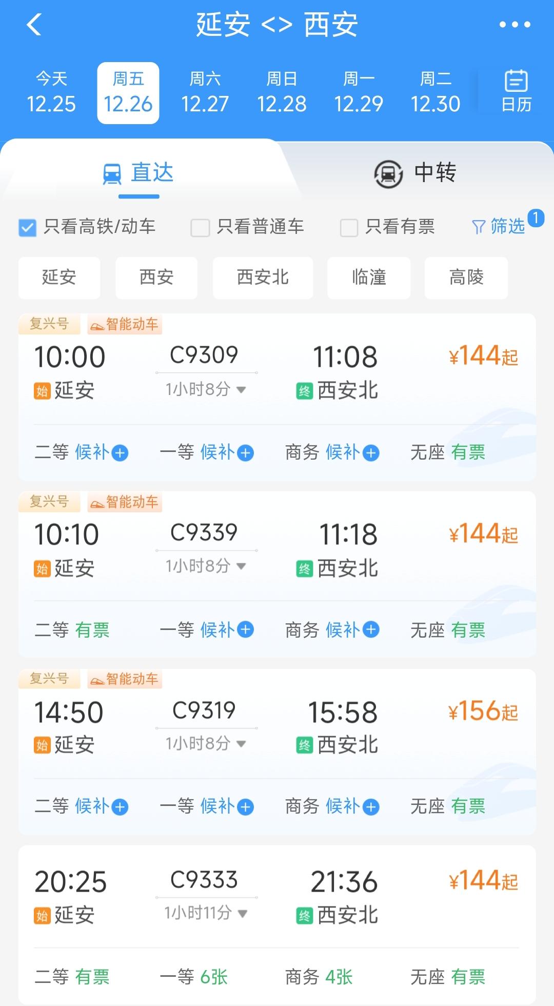 在明天延安到西安的高铁正式开通。因此从12月26日开始延安到西安的时间将从2小时10分钟缩短为1小时8分钟,不过C开头车次票价会比原来贵了50元钱以上。 更主要的是西延高铁开通后,延安的高铁列车大多数还是省内的。大家最为期待延安到广州、贵阳、北京,郑州、武汉、长沙、成都等方向的高铁暂时还没有,见此情景还是希望今后延安能多几趟出省的高铁车次。