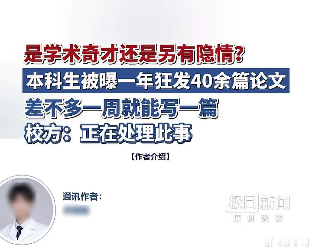医学本科生被曝一年发40多篇论文现在学术圈高中生都可当博导,多发表几篇论文又算啥。现在职称评审不就是要看论文么,既然唯论文数量至上,就别管他怎么发表的。就好比说,凭漂亮脸蛋就能入选,那就不在乎她有没有整容。与其质疑人家论文是怎么来的,还不如反思当前学术评价体系唯数量论的泡沫,即便调查也不能止于个案,更需审视催生这种荒诞现象的土壤。热点观点