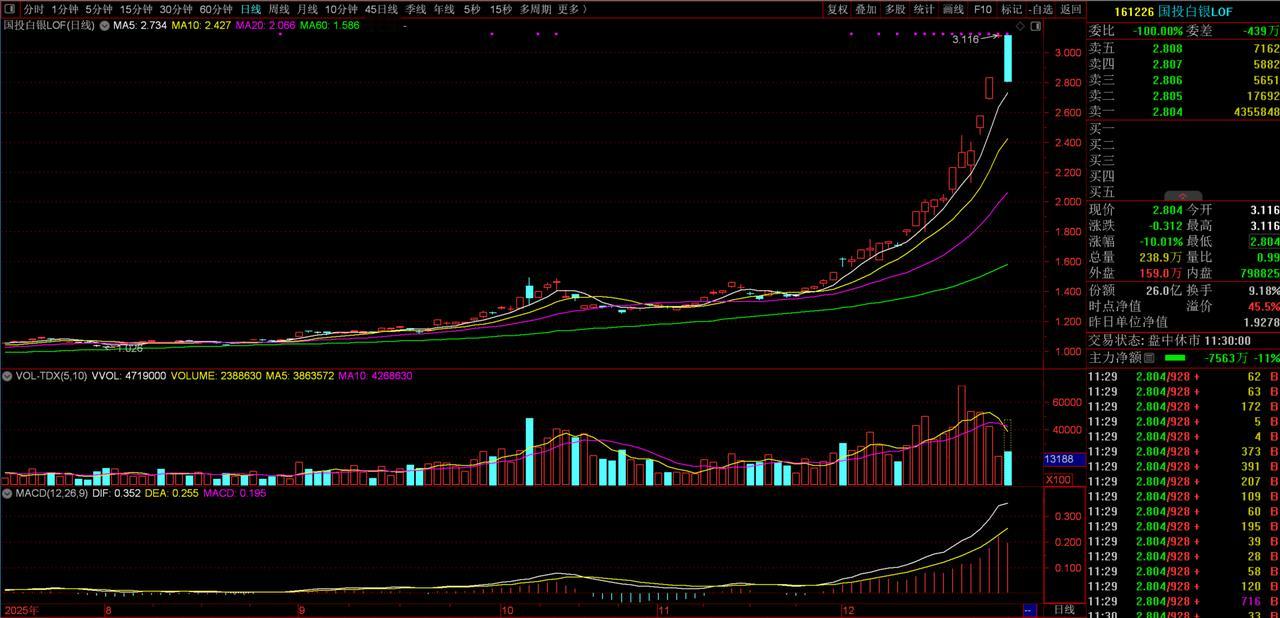 贵金属市场今天发生了一件大事,那就是近期比较热门的国投白银LOF跌停了,从目前跌停的封单看,达到了435万手,这是大家在集体抢跑的节奏,此前的一段时间,因为国际白银价格持续飙升,已经到了71美元,所以相关的基金不断水涨船高,国投白银二级市场的溢价曾经达到了60%,与实际的价格产生了很大的偏离度。 这实际上就是风险加剧的信号,昨夜基金公司提示风险,今天就出现了跌停的局面。对于这个现象没有太复杂的解读,就是当上涨演绎到过于极致化的时候,市场情绪就会突然逆转,今天的跌停就是最好的表现了。 那么,这个基金接下来会怎么走呢? 我想市场情绪从极度看好,到对风险的认识,再回到重新认可,是有个逐步的过程,短期内将会以继续释放风险为主,但是当这个风险释放的很充分的时候,市场依然存在重新调头向上的可能,因为国际白银期货价格未来依然存在继续向上的概率,只要白银期货价格不出现明显的走弱,基金的调整大概率只是短期的风险释放。