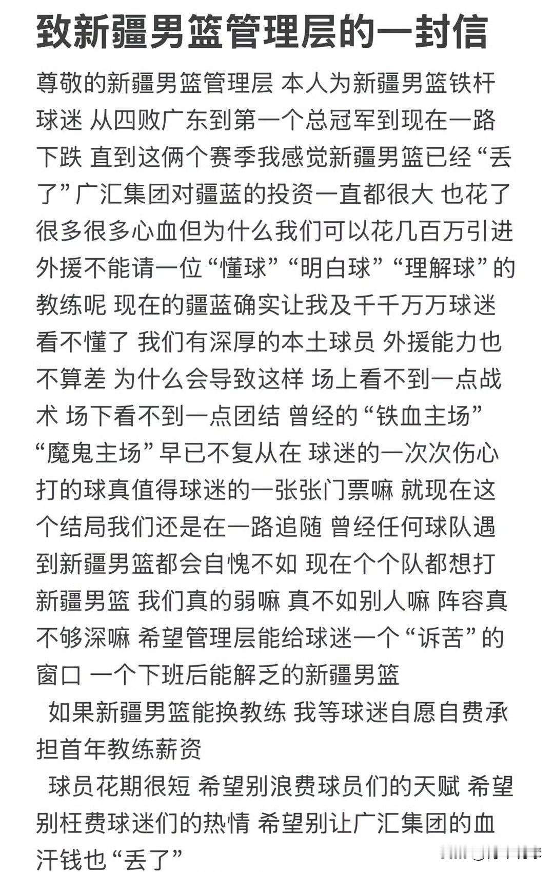 本赛季CBA的主教练不好当啊! 昨天晚上,新疆男篮18分惨败青岛男篮遭遇两连败,现场球迷自发响起“刘炜下课”的呐喊声。不仅如此,有球迷还在社交媒体上给新疆男篮俱乐部写了一封信,表示自己陪伴球队从高潮到低谷,但现在的新疆男篮已经完全变样了,而罪魁祸首就是主教练,‘场上看不到战术,场下看不到团结’,这句话非常犀利,一针见血的指出了球队的问题。该球迷甚至喊话如果球队能更换教练,首年薪资可以由球迷承担,以此来表明自己的态度。这封信在社交媒体上被大量讨论,引发球迷热议,相信也引起了新疆男篮的注意。目前,新疆男篮在本赛季取得了2胜3负的战绩,暂时排名联赛第12位。 本赛季至今,CBA已经有两位主教练下课,有多名主教练一直被球迷喊话下课,无论是在主场、客场还是社交媒体,造成了巨大的舆论压力,主教练这个位置还真不好当啊!