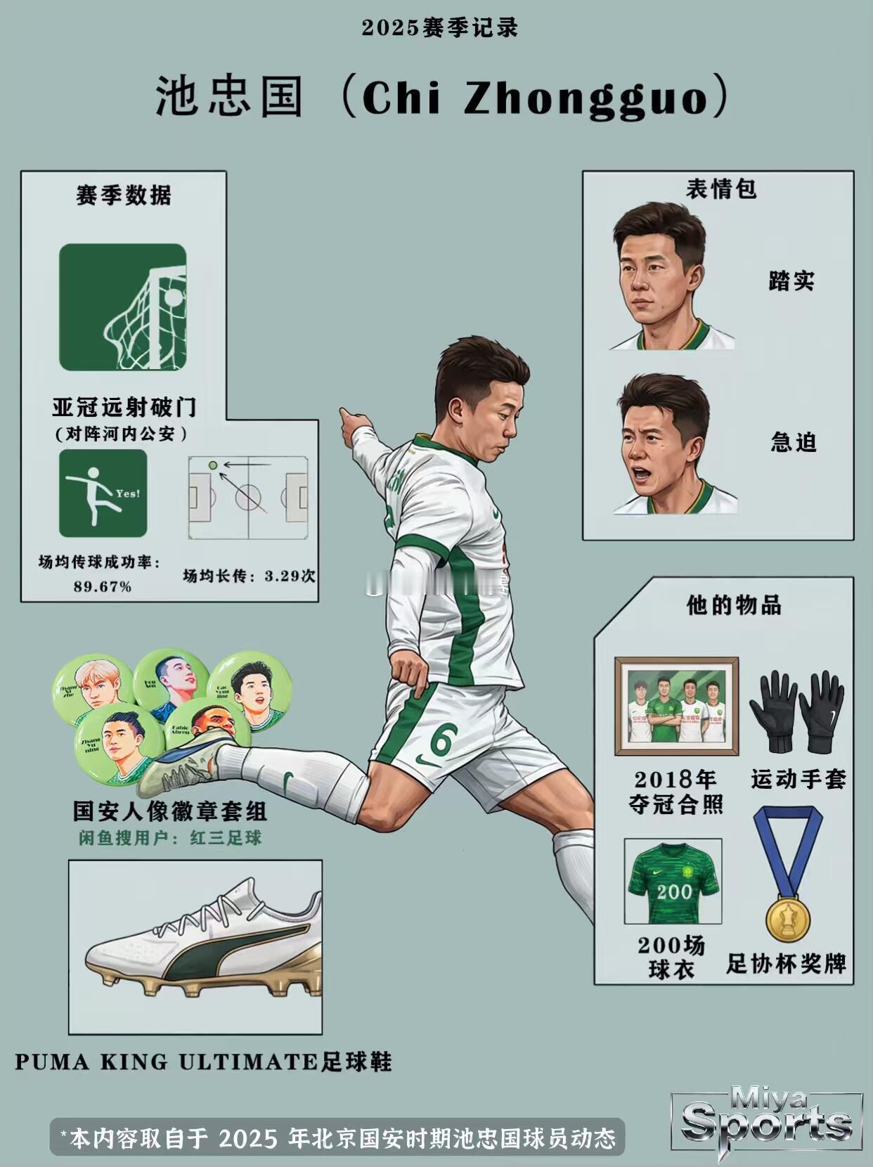 北京国安北京国安 “延吉铁闸”阿里郎池忠国,中国坎特的勤勉国安的中场腹地,🟢留着池忠国数载的拼抢轨迹,2025赛季的赛场之上,他亚冠对阵河内公安远射破门,也把89.67%的场均传球成功率、3.29次的场均长传,🦁写成了中场攻防枢纽的注脚。正所谓绿茵场就是他的疆场,💪从禁区前沿拦截断球到中场调度,草皮上的每一次卡位,都是他为球队梳理攻防的证明👍🏻。他🈶“中国坎特”的执着⚽?他是那种“迎着对手冲击果断上抢,披着绿色战袍跑满每一分钟”的硬汉,亚冠的远射、联赛的梳理,从不是孤军奋战——当队友迎着传球发起进攻,他眼里的沉稳,是数载坚守的模样,连球迷都叹“池忠国在哪站,👏国安的中场防线就稳在哪”!池忠国把汗水揉进了绿茵征程🟢,足协杯奖牌挂脖时,他摸了摸胸前的绿色队徽,一切付出都化作荣光……回望这一路的并肩,👊感谢池忠国以勤勉守国安中场,愿此去前程似锦,顺利奔赴新征程!……