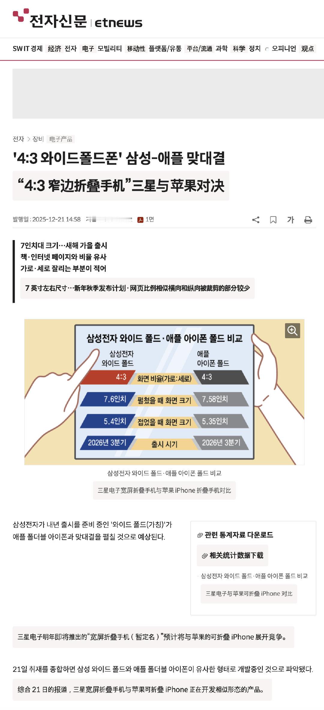 etnews:三星筹备“阔折叠”,内部代号为“Wide Fold”。三星计划让 Wide Fold 采用与折叠 iPhone 接近的规格,展开时 7.6 英寸显示屏,折叠状态下为 5.4 英寸,同样使用 4:3 的显示比例……上市时间将与苹果折叠 iPhone 大致重叠。不愧是三星!