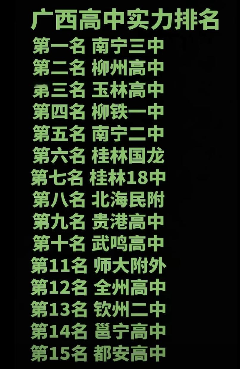 广西高中实力排名第一名南宁三中第二名 柳州高中第三名玉林高中第四名 柳铁一中第五名 南宁二中第六名 桂林国龙第七名 桂林18中第八名 北海民附第九名 贵港高中第十名 武鸣高中第11名 师大附外第12名 全州高中第13名 钦州二中第14名 邕宁高中第15名 都安高中