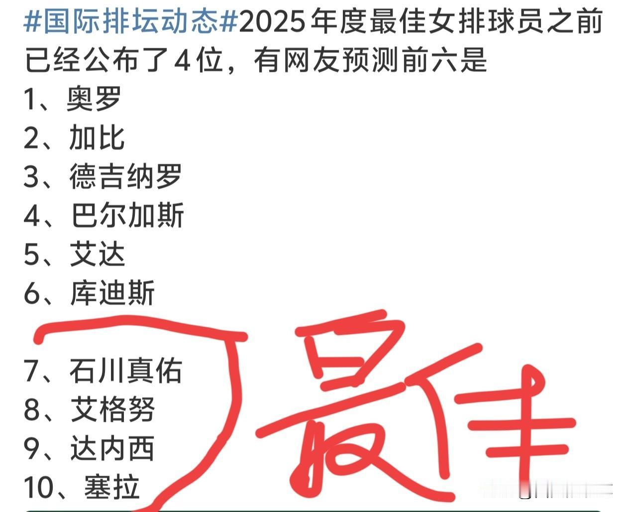 2025女排世界最佳,没有吴梦洁,也没有庄宇珊[捂脸] 女排世界最佳已出炉四位,被意大利、和日本女排瓜分,剩下的六名,也预测了结果,清一色的欧美运动员。总之,没有赵勇带领的中国女排。 中国女排成绩,现在退步明显,需要加把劲向前冲了。女排巨星风云榜 女排实力 女排对比 女排历史排名