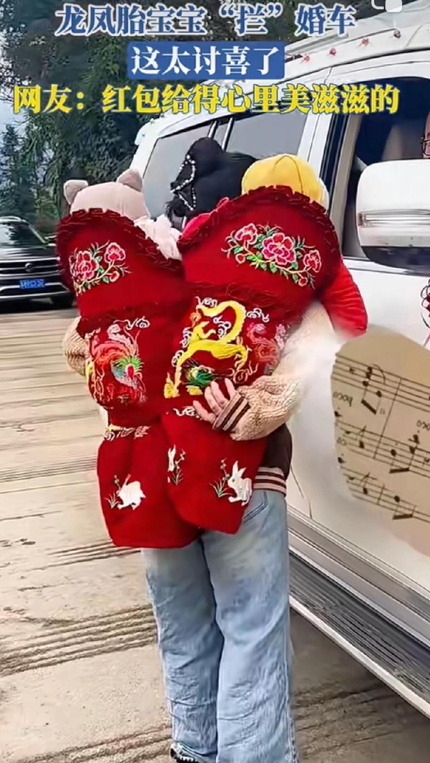 这应该是主家专门安排的拦婚车吧,一位宝妈背着两个龙凤胎宝宝,宝贝的包被还用的龙凤呈祥。 新郎新娘喜笑颜开的拿出大红包,这样拦婚车讨红包的才被大家喜欢。 就好像以前传下来的民俗新人的床要家族里面儿女双全的人来扫床,寓意沾沾喜气,以后自己也能儿女双全。