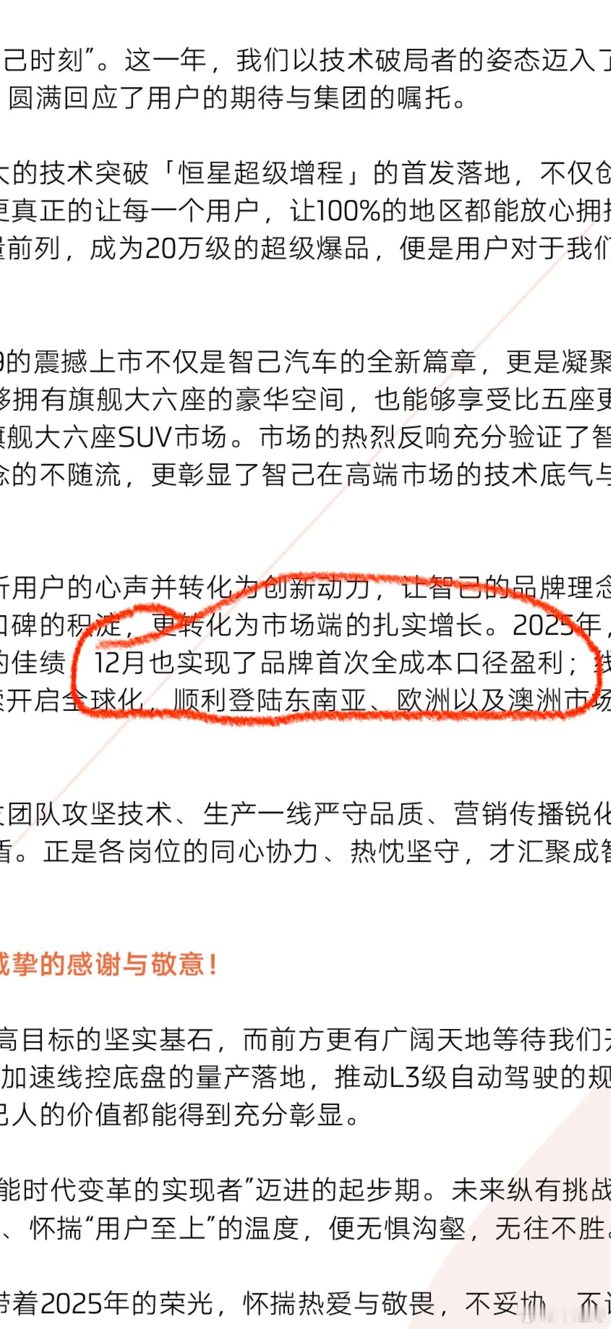 这几年一路看着智己的变化,确实不容易,他们这群人真诚,有个性,进步很快,总能把产品做的很有新鲜感。其中信中有句话“12月首次实现全成本口径盈利” 这也是这群人一种坚持后的成果。当然我个人觉得这只是个好的开始,明年产品会更丰富更好,大家可以放心一点保持期待吧!