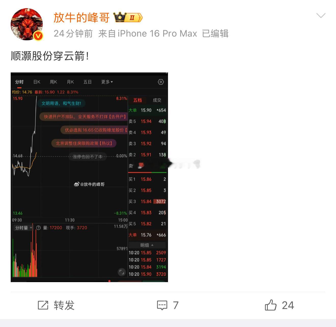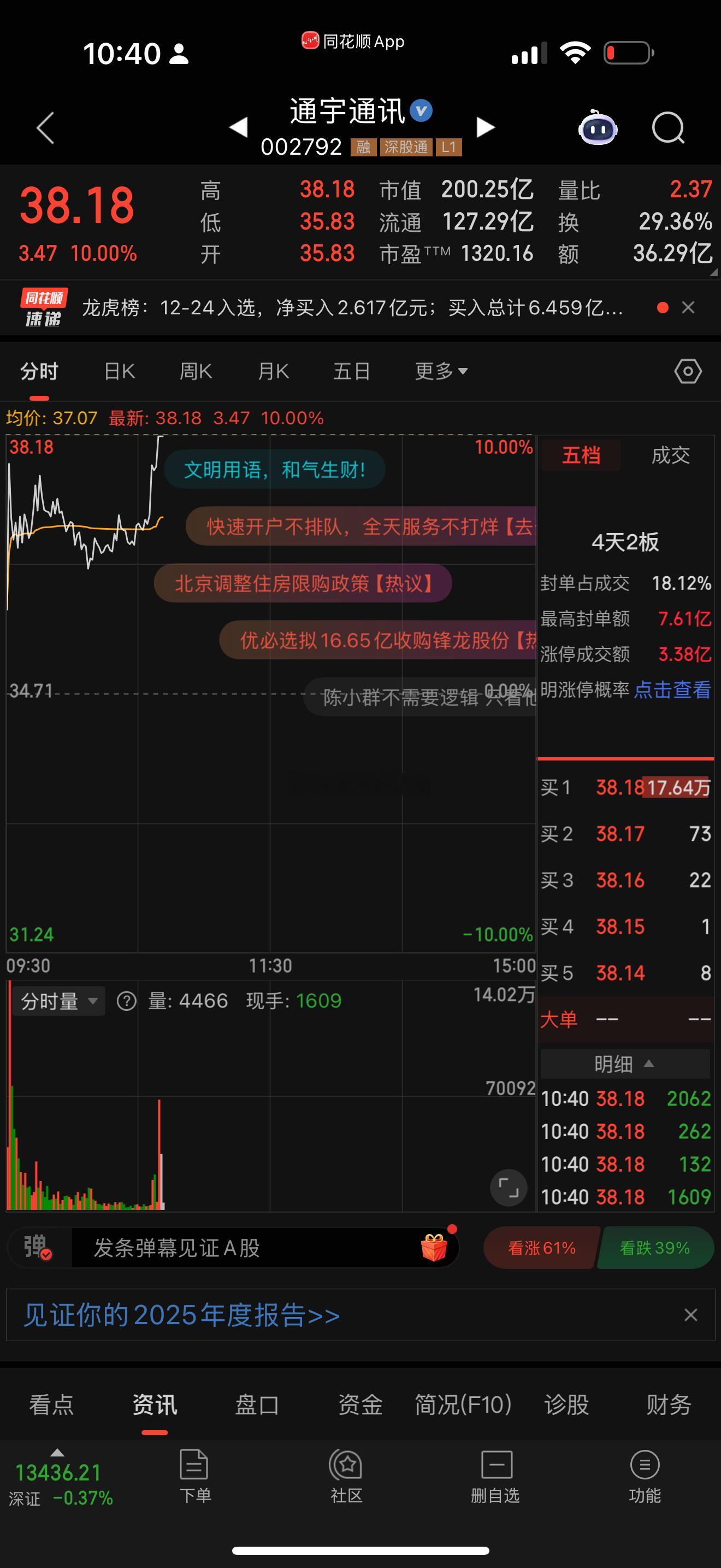 归来第一个票涨停!实力任然在线通宇通讯002792!我说了前几天有事,有事,有事,等我回来! 顺灏股份也涨停了,没买!
