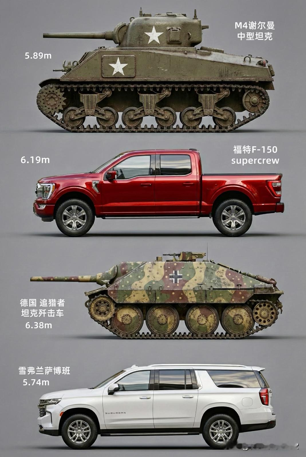 在这些比坦克还长的车面前 大G X7都好小! 什么SUV能让俗称“大G“的奔驰G63看起来像个玩具? 汽车肥胖症“Autobesity”是一个在汽车业界已经被广泛讨论的一个现象。汽车正在逐年增大,美系车则是这里面最典型的代表。当今的全尺寸皮卡和SUV,长度已经全面超越了二战时期的坦克,一辆谢尔曼中型坦克的占地面积并不比F-150 Supercrew或雪弗兰萨博班更大。坦克是在旷野 森林 废墟中搏杀的战争巨兽,而这些皮卡SUV却要每天在人多车多的交通中往返于居民区、超市停车场和狭窄拥挤的城市道路。 如果对坦克的尺寸没什么概念,我们来和更常见的车型来比一比。在亚洲和欧洲,宝马X5是中大型 SUV,X7更是旗舰级大车。但在这些美系全尺寸 SUV面前,它们瞬间变的娇小而苗条。一辆近六米长 2米多宽的大皮卡,根本无法停进正常停车位,往往必须跨线停车,车头还要伸出来一大截。 这么大至少一定很安全?但实际上这些巨型车是名副其实的害人又害己的马路杀手。在碰撞中,面对这些车巨大的重量和高耸垂直的车头,行人和正常车辆成员的死亡率大幅提升。而对它们自己来说,高重心和大重量带来的糟糕操控性,使得这些巨兽在单车事故(如翻车)中的表现非常惨烈。统计数据显示,全尺寸车辆司机的单车事故死亡率并不低,而且因为虚幻的安全感,这些司机更容易做出冒险行为。 几十年前,皮卡和 SUV 的尺寸还算理智。那时它们是农夫和建筑工人的伙伴,是纯粹的生产力工具。但现在,在汽车厂家营销和“雄性焦虑文化”的推波助澜下,这些车成了一些人找回自信的解药。很多人不惜背负高昂的利息贷款,也要买下一辆从不拉货、从不越野的巨兽。他们通过俯视他人来感受权力,用路霸行为来填补内心的虚弱。车厂也对此喜闻乐见,因为这些又大又贵的车有更高的利润率。在美国,通用和福特甚至全面砍掉了自己的紧凑型车和轿车产品线。 这些躲在巨型铁皮壳子里,试图用尺寸和路霸行为找回尊严的人,最缺的是什么?我只知道,人越缺什么,就越要追求什么。